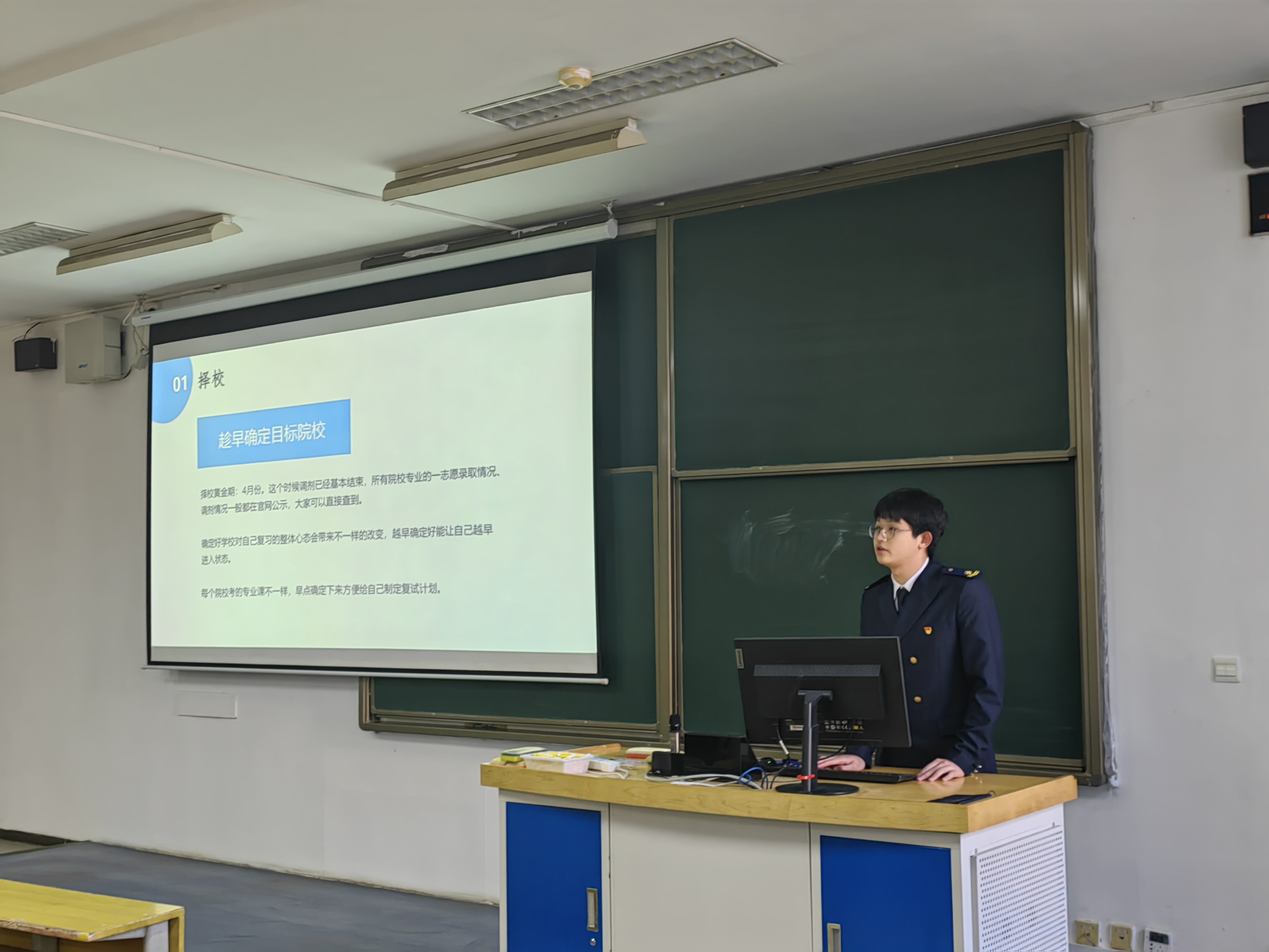 黄欢、冯志杰两名同学做报考外校经验分享。他们分别从院校选择、报考外校的困境及自身备考经历展开分享,提醒同学们提前确定目标院校、掌握考试大纲,合理科学制定复习计划。