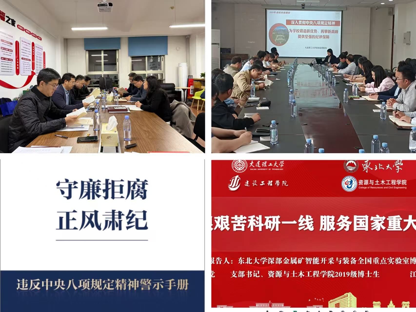 学院党委为全体师生党支部订购配发学习资料,每月制定理论学习计划参考,部署学习教育月度工作安排和工作提示,指导全体党员原原本本学、准确把握原文原理。编撰《守廉拒腐 正风肃纪——违反中央八项规定精神警示手册》,梳理中央八项规定精神相关文件,汇编学校部分管理制度,选取63例违反中央八项规定精神案例,教育引导全院教职工筑牢拒腐防变思想防线。第二本科生辅导员师生纵向党支部和东北大学资源与土木工程学院本科生第二党支部联合举办题为“深入贯彻中央八项规定精神学习教育,践行初心使命”的党日活动,共同学习中央八项规定精神,引导青年党员传承红色基因,服务国家重大工程。结构监控师生纵向党支部举办“青春心向党 奋楫正当时”毕业生党员主题党日活动,党支部书记讲授最后一堂党课,开展行前教育,引导毕业生党员在各自的岗位上建功立业,不懈奋斗。