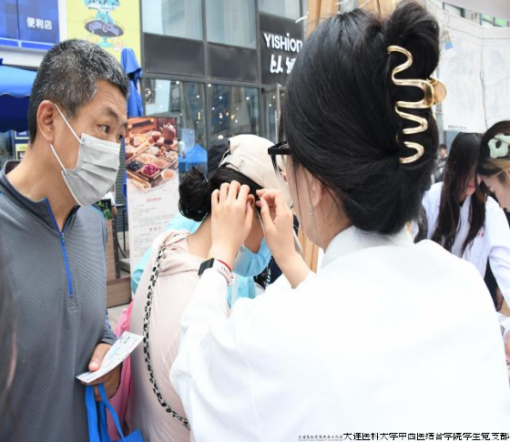 文创产品展示区陈列着设计精巧、融合中医药元素的实用物品,拉近了古老智慧与现代生活的距离。健康知识宣传区则化身科普阵地:师生们热情分发图文并茂的《二十四节气养生宣传手册》和《中医药文化科普知识台历》,并耐心解答市民咨询,普及科学养生观。尤为引人注目的是手部反射区电流脉冲按摩以及耳豆压穴体验,师生们专业讲解并指导市民体验,将中医“治未病”理念与现代科技巧妙结合,使市民直观感受经络奥秘,学习掌握“随时随地养生”的简易手法。现场人潮涌动,市民参与热情高涨。
