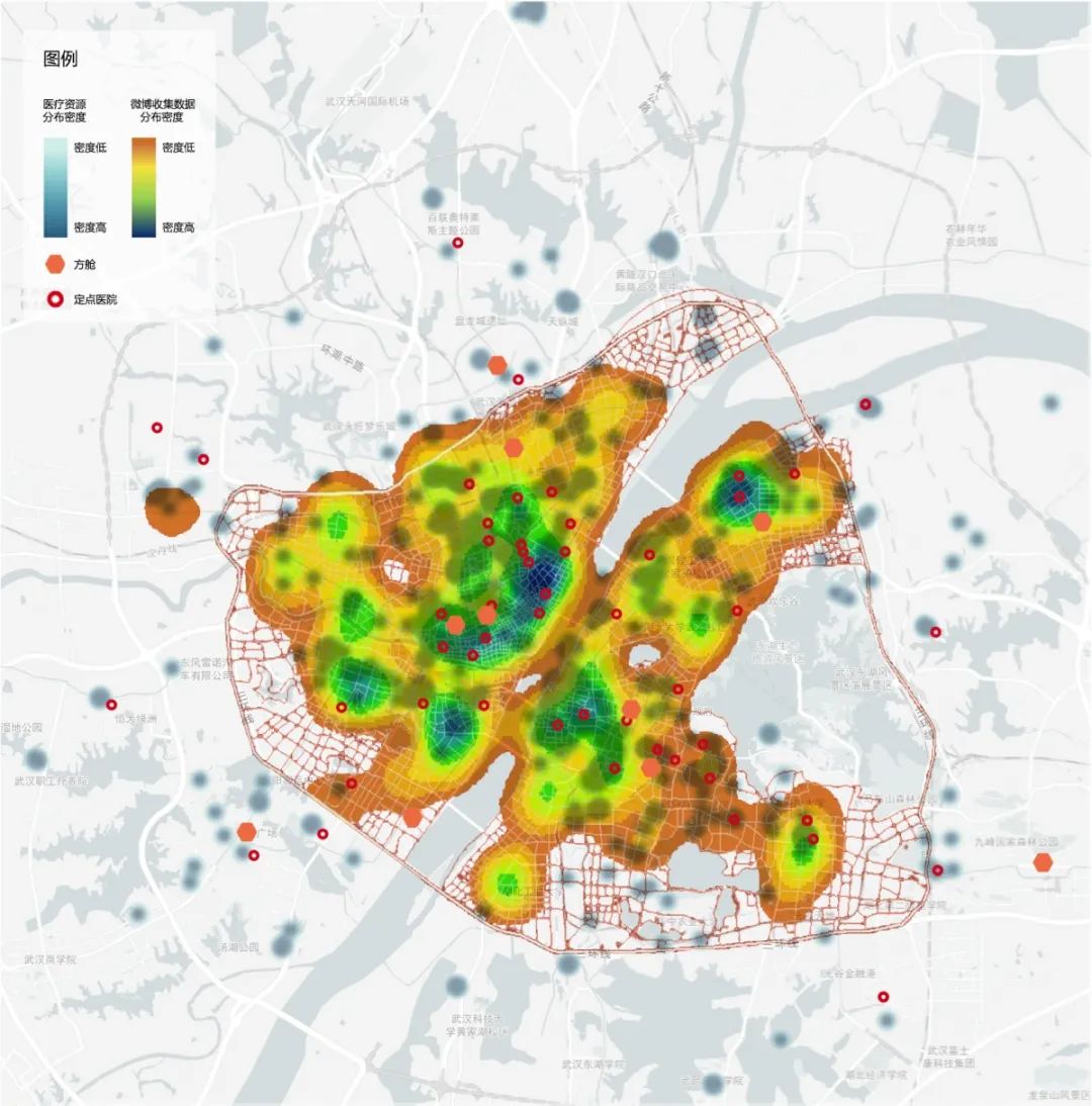 可视化结果:结合2月中旬的疫情,进行了医疗资源分布与患病人群分布进行相关性分析。将武汉市医疗POI核密度分布图作为底图,并在其中标出了70家定点收治新型冠状肺炎的医院及新建的医疗方舱的位置。这些信息与截止当时的未收治患病人群分布核密度图(图片来源:公众号“城市创新实验室”)进行叠加,可获得武汉医疗设施分布与未收治病患分布图。
