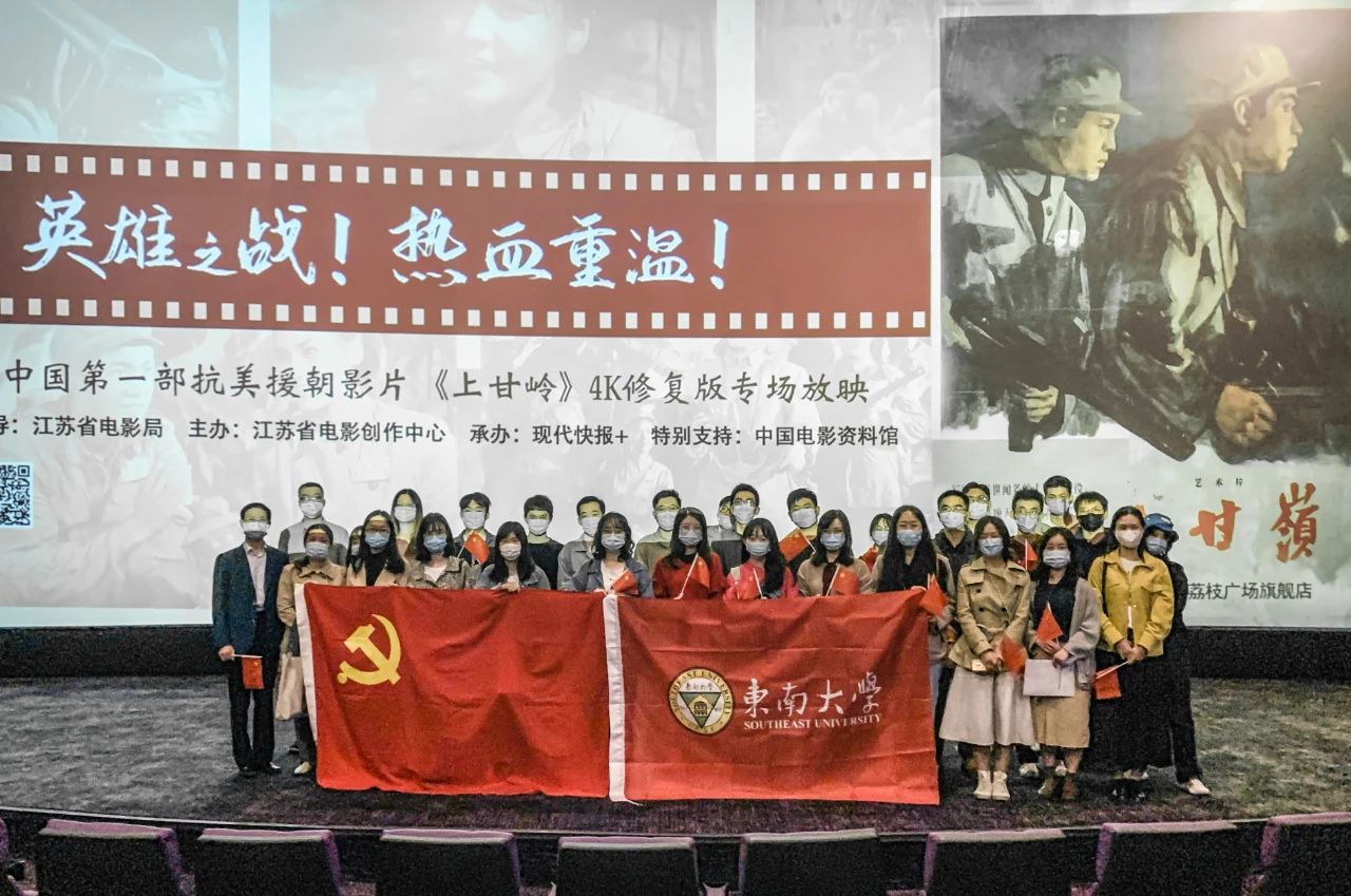 为了纪念中国人民志愿军抗美援朝出国作战 70 周年,在东南大学党委宣传部的组织下,建筑学硕士生八支部的成员作为东南大学学生代表,于2020年10月20日参加了新中国第一部抗美援朝电影《上甘岭》4K 修复版专场放映。本次活动由江苏省电影局指导,江苏省电影创作中心主办,现代快报 + 承办,中国电影资料馆特别支持。