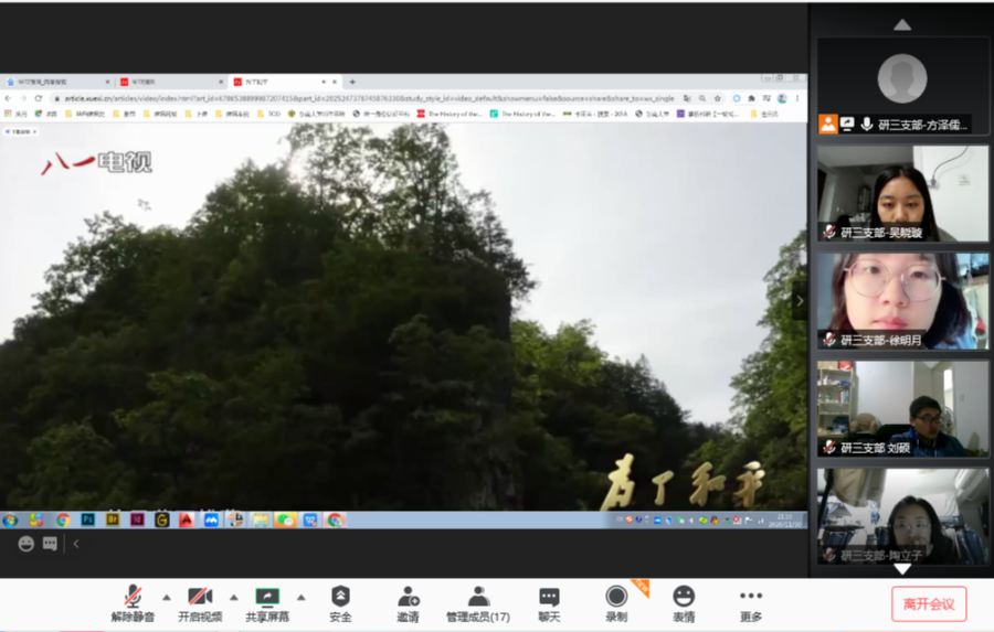 建筑学硕士生三支部于2020年11月30日19:00在线上腾讯会议组织了大型历史事件纪录片《为了和平》的放映,全体党员、支部委员都在线上参与了此次观看纪录片活动。