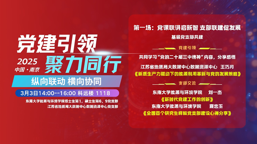 为认真学习贯彻习近平新时代中国特色社会主义思想和党的二十届三中全会精神,2025年3月3日,江苏省地质局大数据中心数据资源中心党支部与东南大学能源与环境学院博士生第1党支部,硕士生第6、9党支部联合开展以“党课联讲启新智,支部联建促发展”为主题的党日活动,旨在通过同上一堂党课,促进双方共建交流,激发支部活力,提升党员素养,推动党建与业务工作深度融合,实现共同发展。