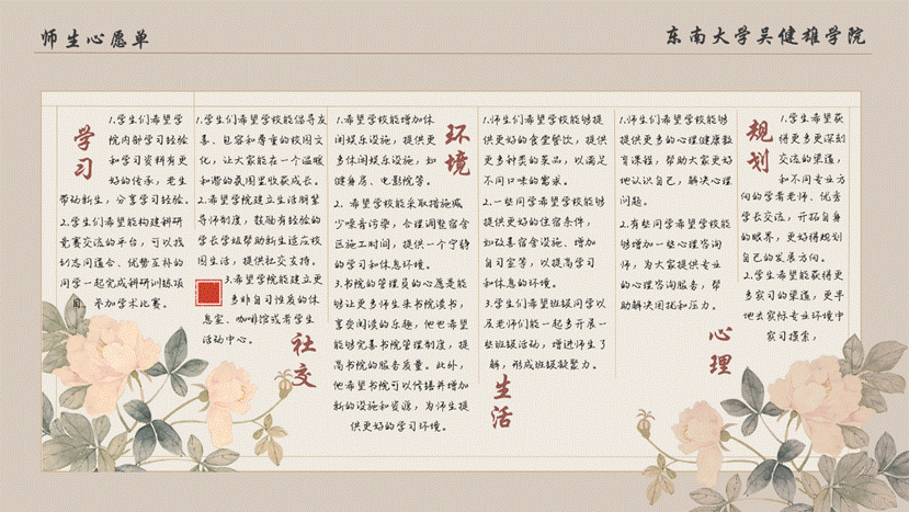 20级的吴院学子即将步入大四,他们正处在人生的十字路口。他们表示,大学生活让他们接触了各种学科和领域,大四是决定自己未来职业道路的关键时期。他们会深入思考自己的兴趣、优势和价值观,找到与之契合的职业方向,并为之制定明确的目标和计划。他们会积极寻找实习、就业或研究生的机会,为自己的未来做好充分准备,也希望学院能够提供这方面的指导。