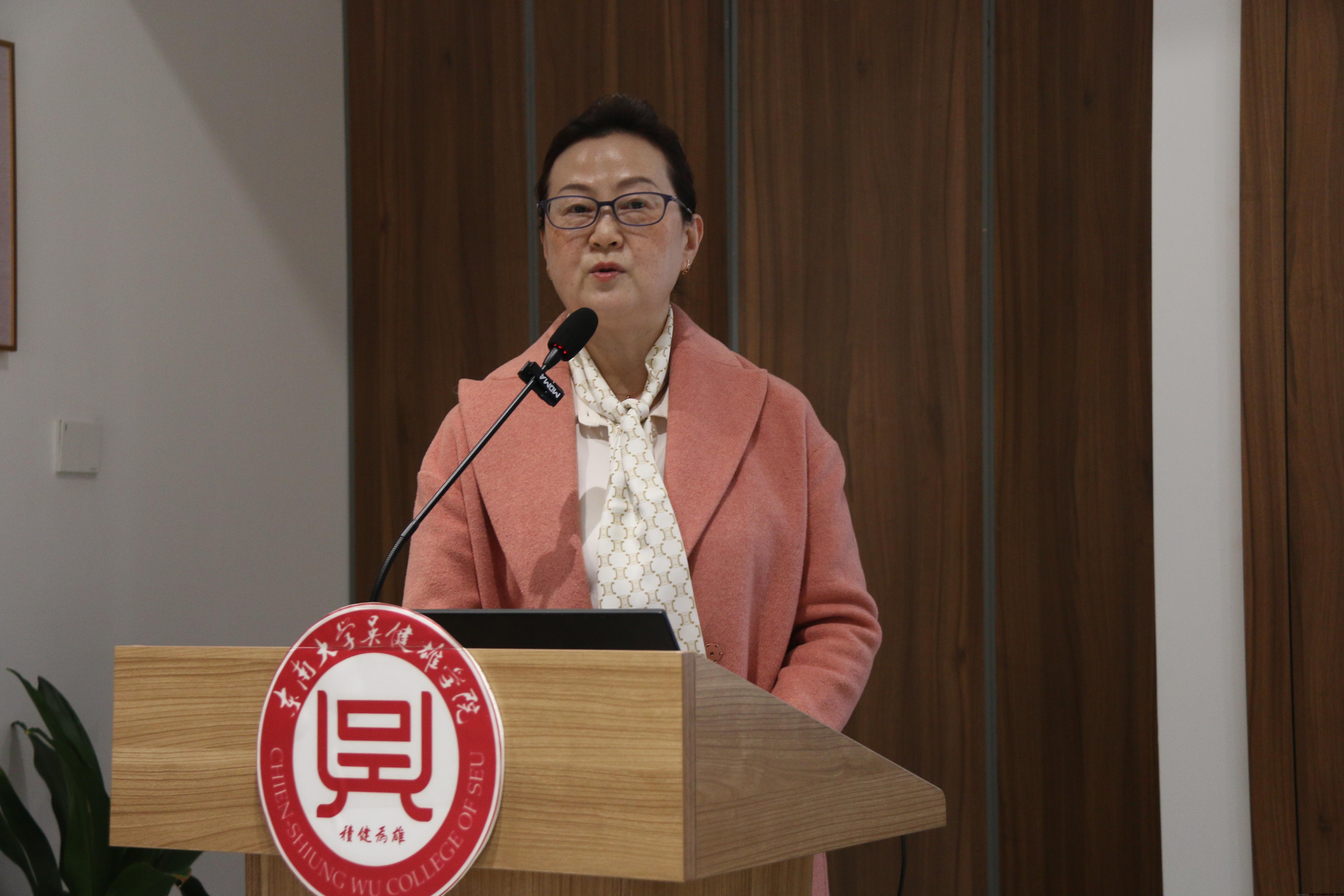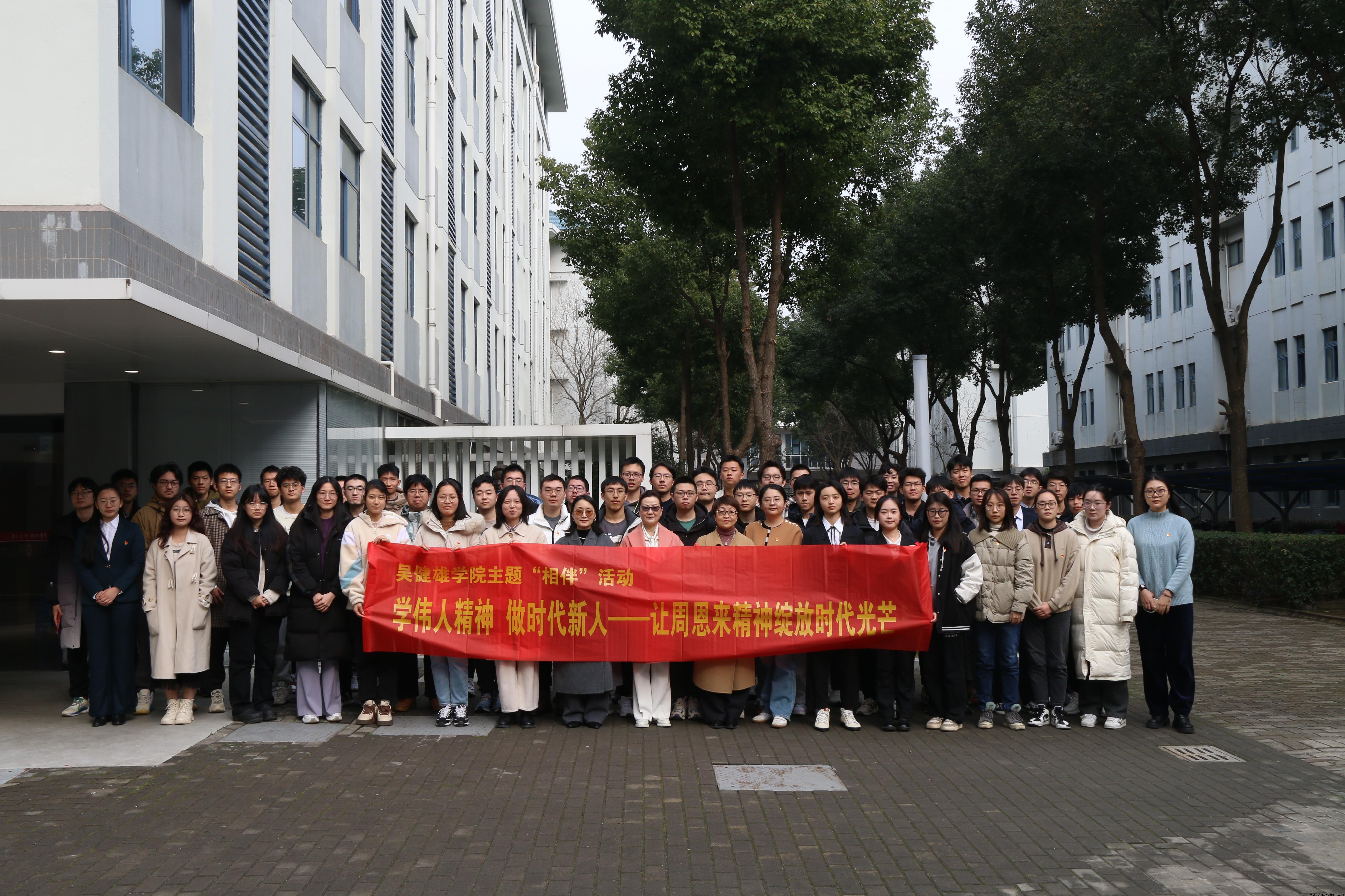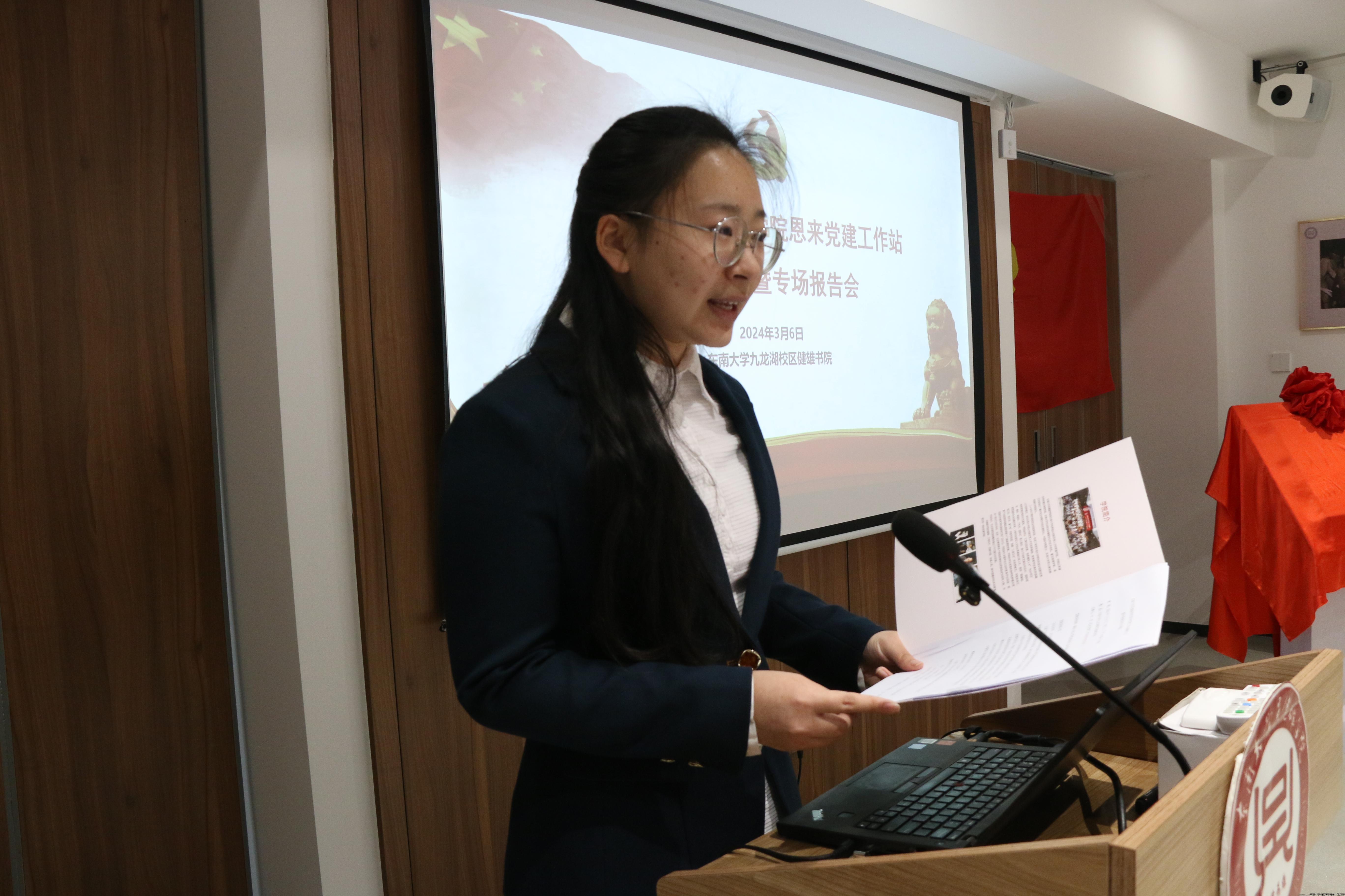 2024年3月6日下午,东南大学吴健雄学院恩来党建工作站揭牌仪式暨专场报告会在九龙湖校区健雄书院隆重举行。支部特别邀请周恩来侄孙女、上海翔宇公益基金会执行理事长周蓉女士在仪式上作报告。报告主题为“见字如面,家风永传——从周恩来邓颖超处理亲属家事的原则论周恩来家风”。吴健雄学院第一党支部全体党员参加本次活动。支部副书记杜爱主持。