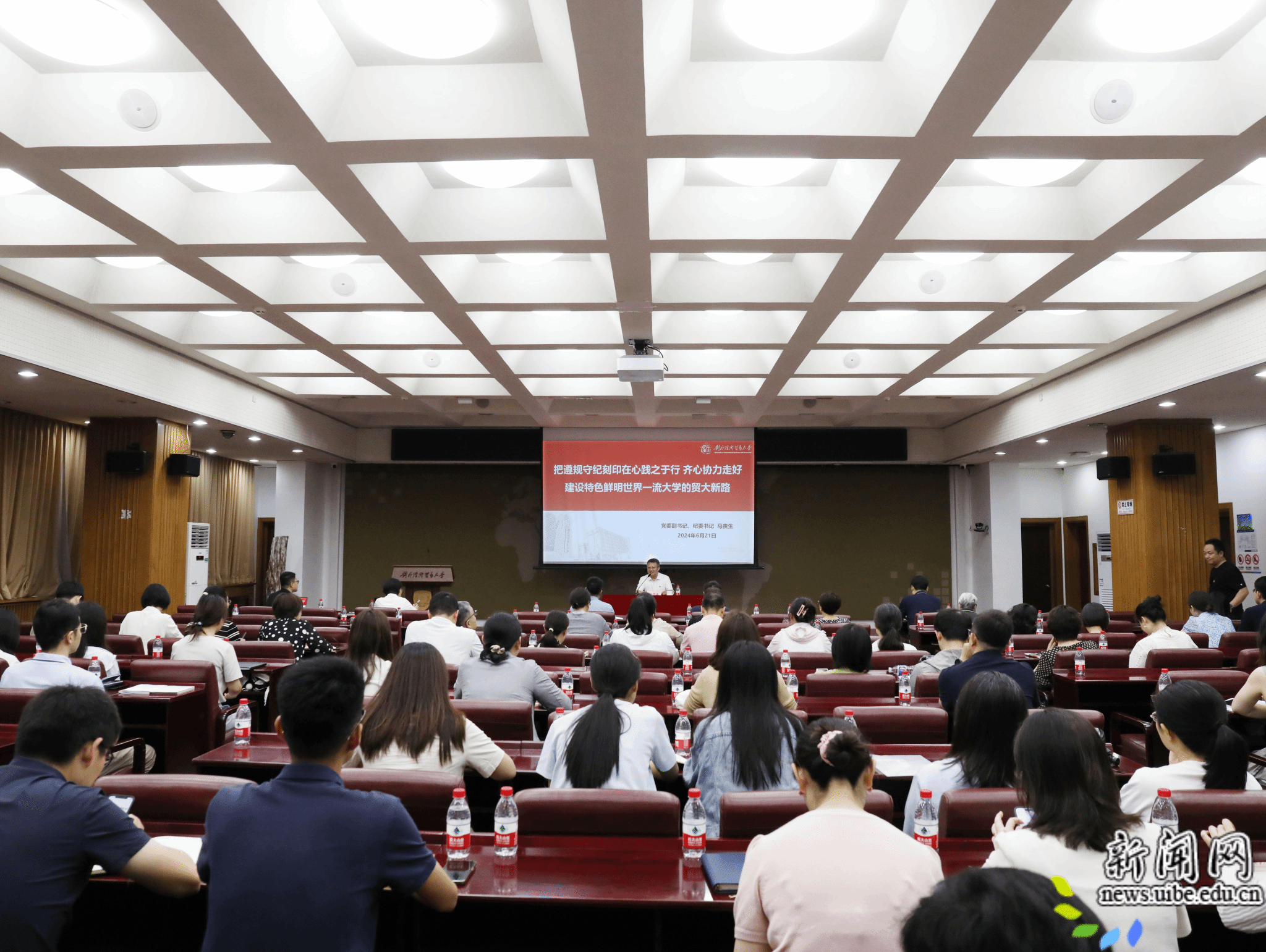 校新闻网讯(纪委办公室/监察处供稿 摄影 艺萌)为进一步推动党纪学习教育走深走实,帮助党员、干部更好领会习近平总书记关于全面加强党的纪律建设的重要论述,做到党纪学习教育与业务工作“两手抓、两促进”。2024年6月21日上午,党委副书记、纪委书记马贵生以“把遵规守纪刻印在心践之于行,齐心协力走好建设特色鲜明世界一流大学的贸大新路”为题讲授党纪学习教育专题党课。全校二级纪检委员、重点领域关键环节岗位干部、年轻干部代表等130余人参加,党委常委、组织部部长李洁主持。