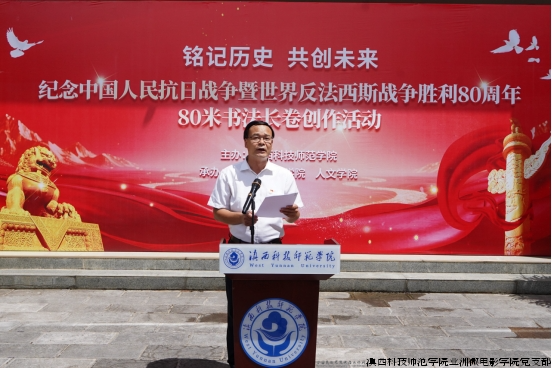 阮凤斌在致辞中指出,此次活动以书法长卷创作纪念抗战胜利80周年,旨在铭记历史、共创未来。他强调,伟大抗战精神是中华民族宝贵的精神财富,希望师生通过笔墨感悟历史、传承精神,作为国门高校,滇西科技师范学院始终坚守“为党育人、为国育才”的使命,服务边疆发展。他鼓励教师将红色文化融入教学,引导学生成长成才;期望学生勤学笃行、奋发有为,成为堪当民族复兴大任的时代新人,为建设祖国、服务边疆贡献青春力量。