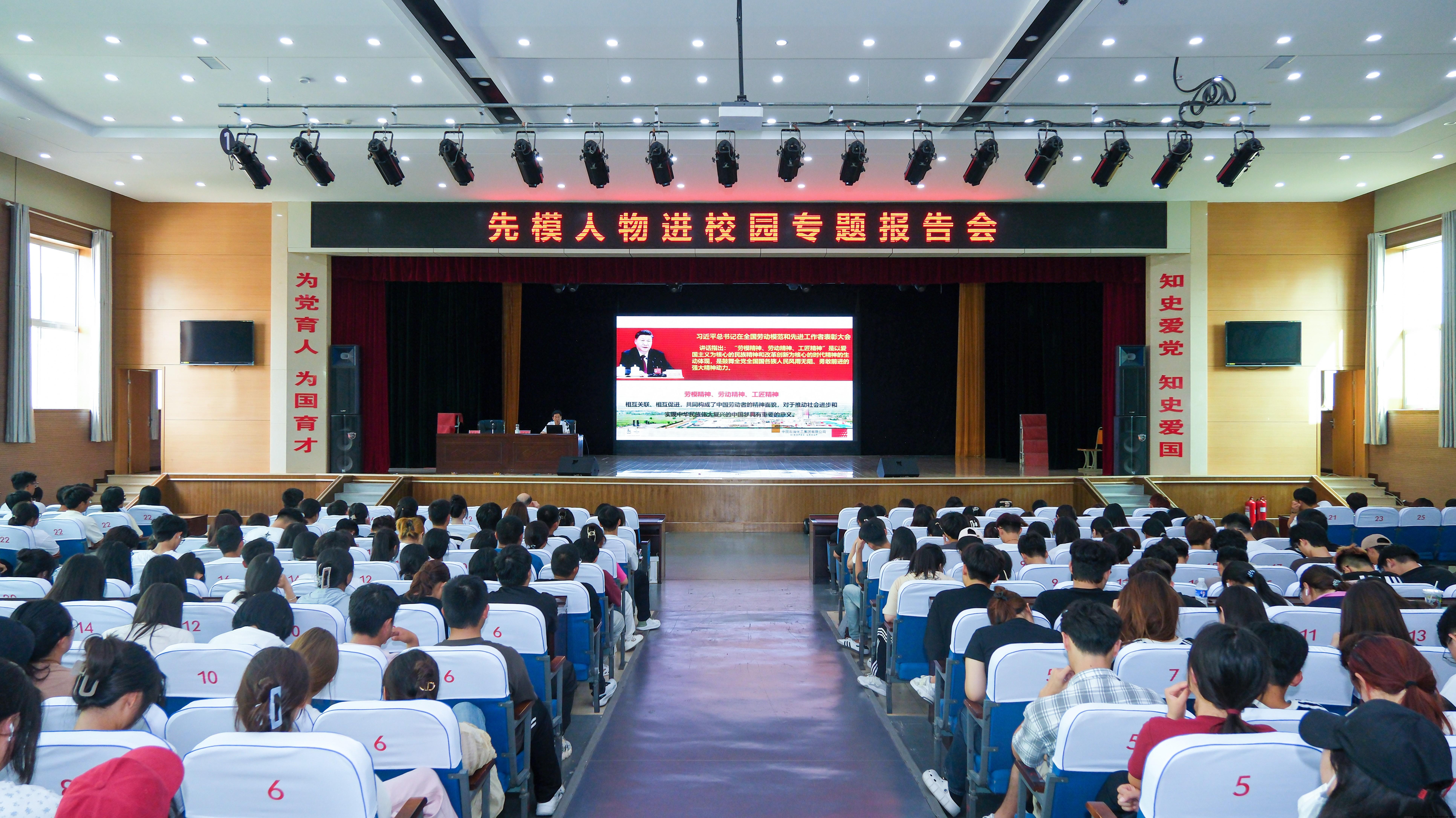 9月19日下午,我校组织的先模人物进校园专题报告会在学校大礼堂举办。此次报告会是我校师德师风建设教育月系列活动之一,邀请黄河三角洲产业领军人才、山东省首席技师、泰山产业领军人才、全国能源化学地质系统大国工匠、中国石化胜利油田分公司采油工首席技师、高级工程师冯新永和全国技能大赛优秀指导教师、齐鲁最美教师、齐鲁工匠、东营市化工学校空调与制冷专业教师、高级技师周建新两位劳模工匠走进校园为我校师生作报告。报告会由工会副主席董藏收主持,1000余名师生参加了活动。