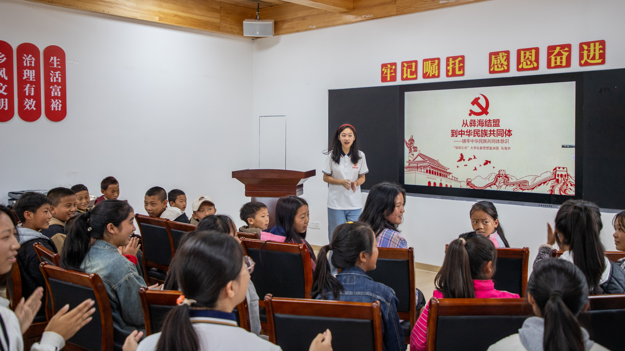 宣讲员马海宇以红军长征为背景,向大家讲述了“彝海结盟”这一民族团结的历史佳话。他从红军入川、借道北上讲起,着重介绍了时任红军总参谋长兼先遣军司令员刘伯承和彝族果基家支头人小叶丹以水代酒、歃血为盟的故事。他鼓励小朋友们积极学习民族团结进步的历史,继续发扬“汉彝友谊长,中华一家亲”的优良传统,更好地铸牢中华民族共同体意识。