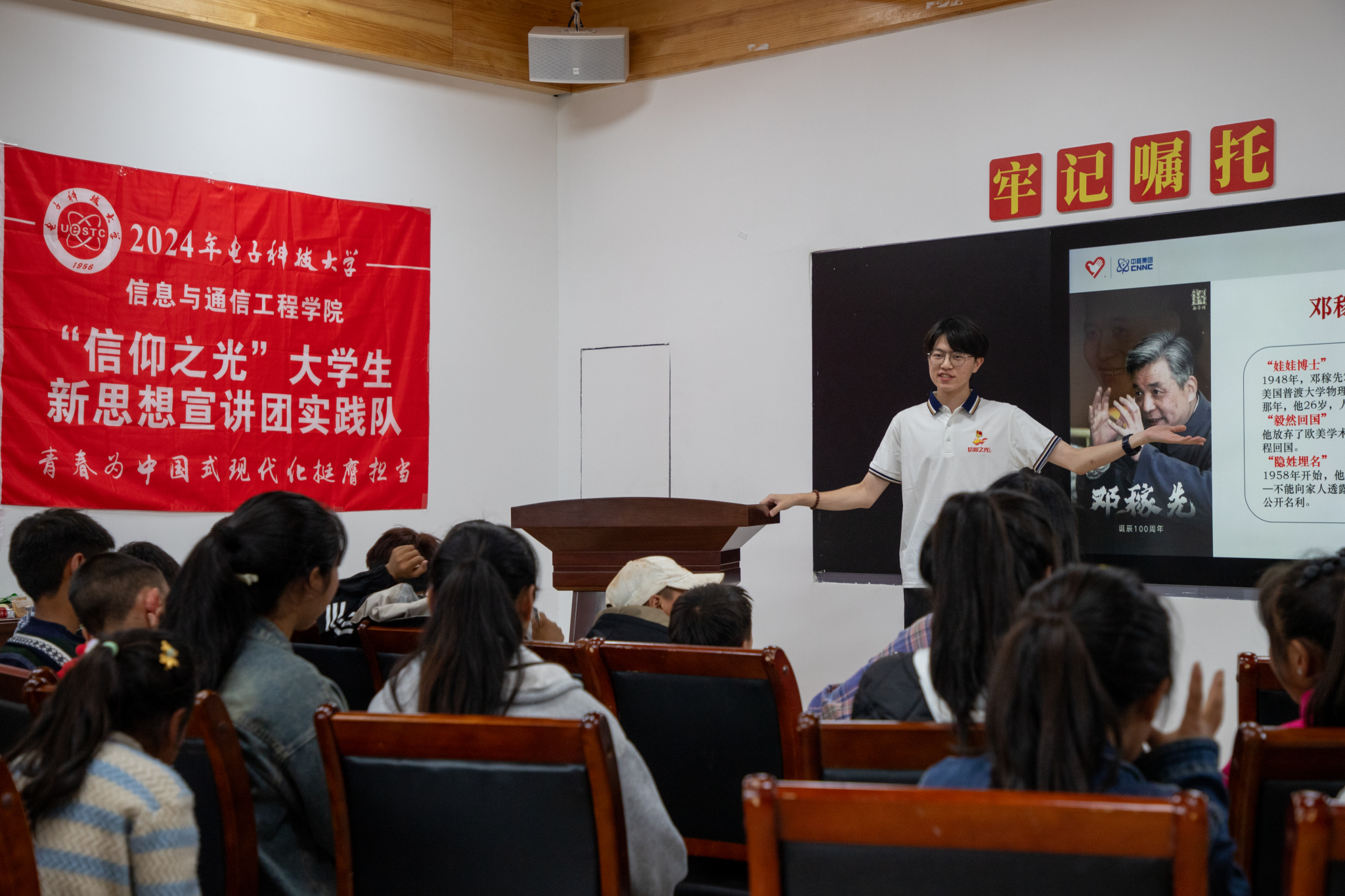 7月10日,信通学院“信仰之光”大学生新思想宣讲团在凉山州昭觉县三河村,与西南财经大学实践队携手,面向三河村中小学生开展“讲好中国故事,争做有为少年”的主题宣讲活动。宣讲团10名成员参加活动,他们均是信通学院本科生第七党支部成员。