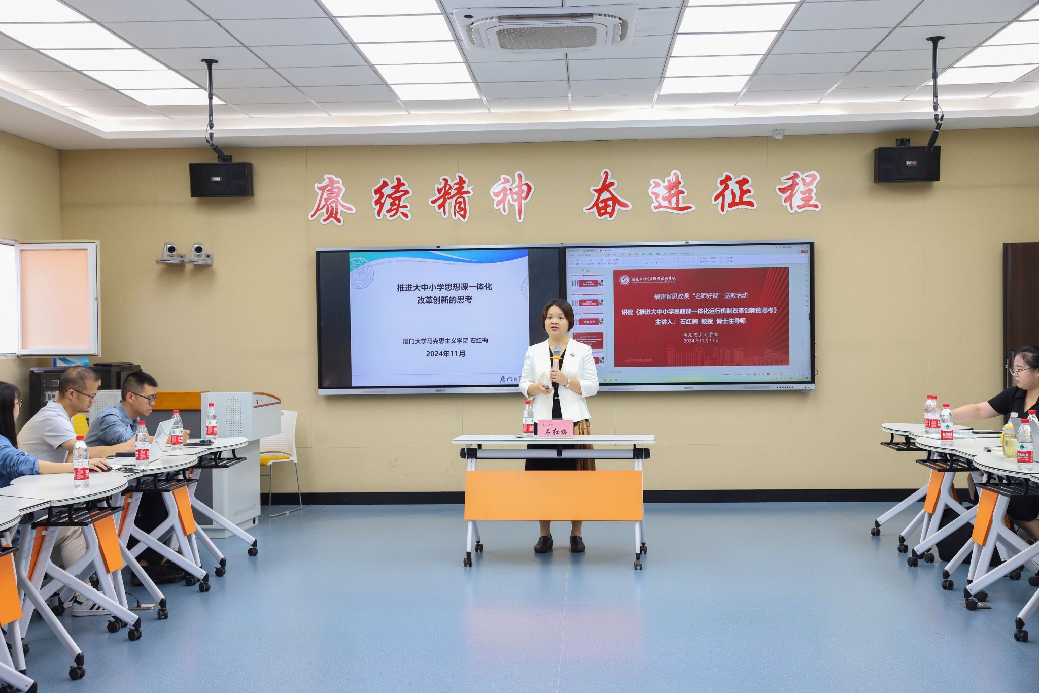 2024年11月17日,我校特邀福建省思政课“名师好课”送教活动第一组专家、全国高校思政课名师工作室负责人、厦门大学马克思主义学院党委书记石红梅教授,到校开展“名师好课”送教活动暨“习近平总书记在福建考察时的重要讲话精神”融入思政课教学研讨会。全体思政课专任教师参加。
