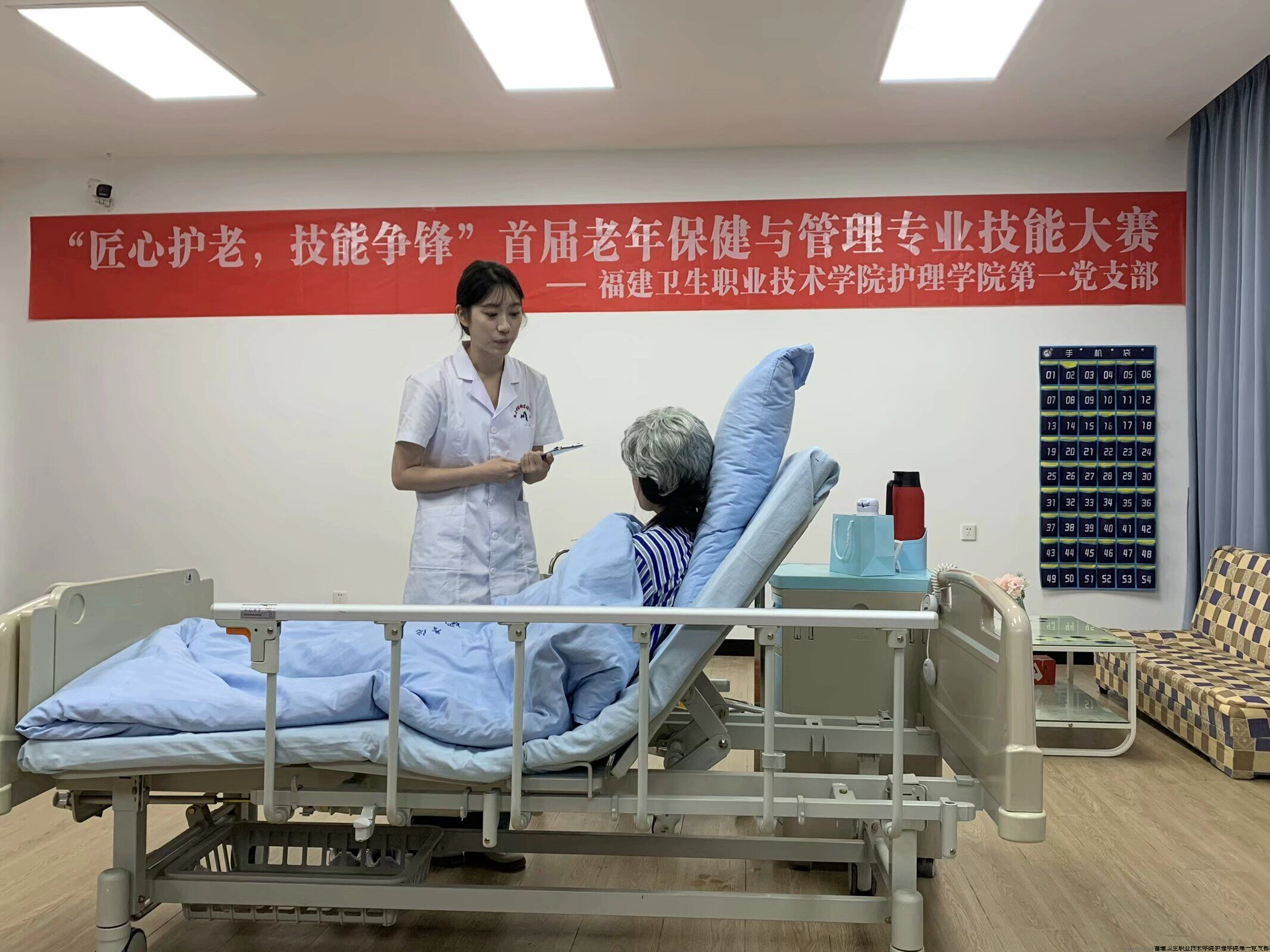 大赛分为理论项目和技能项目两大板块,吸引了护理学院22级和23级老年保健与管理专业的学生积极参与。护理学院院长肖春秀、教务处副处长李淼淼、护理学院副院长王宪宁、福建中和医养护联健康管理有限公司人力主管郭丁铭、老年保健与管理专业全体老师们及护理学院第一党支部成员出席了此次活动。