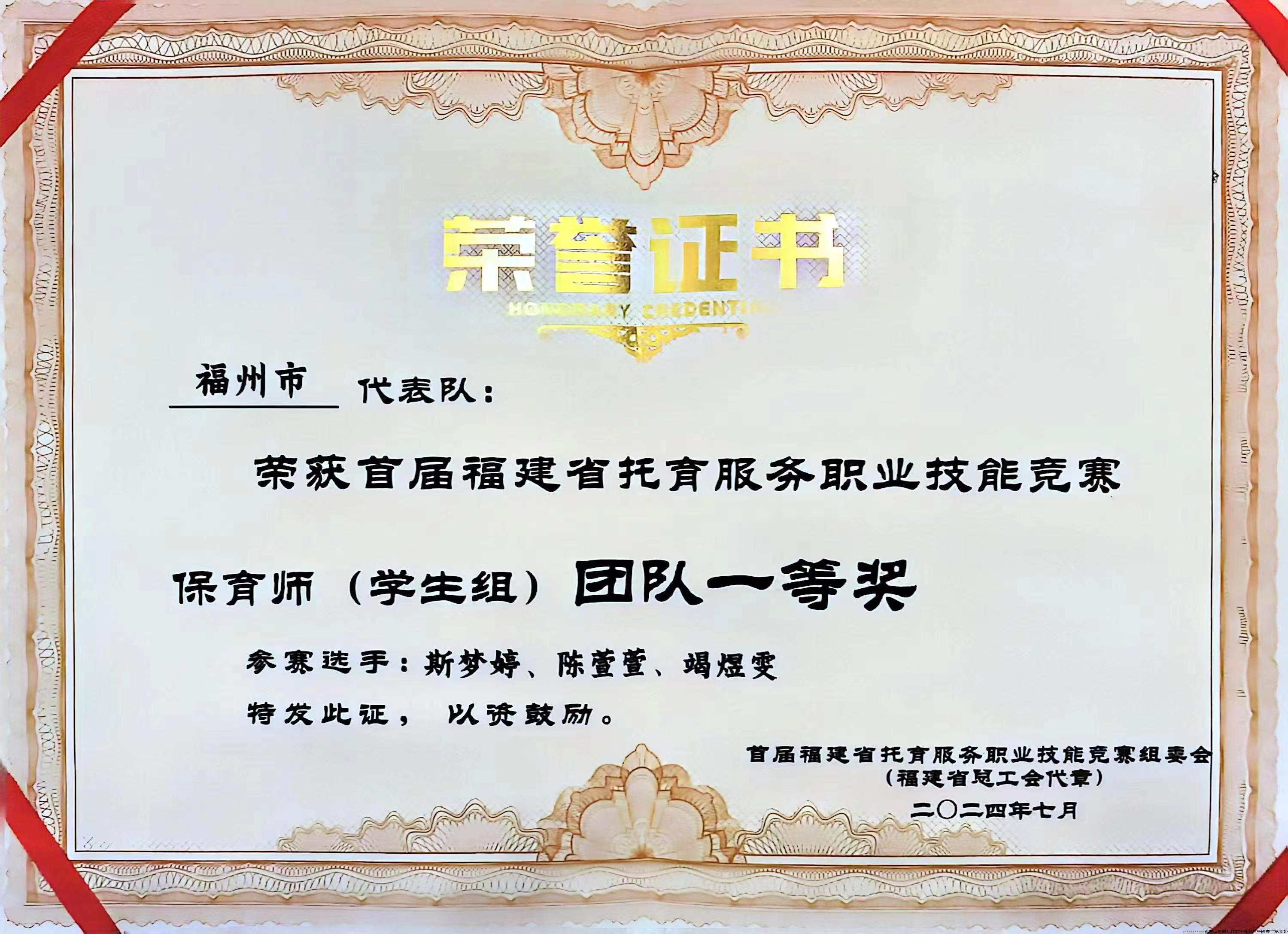 首届福建省托育服务职业技能竞赛保育师(学生组)团队一等奖获奖证书