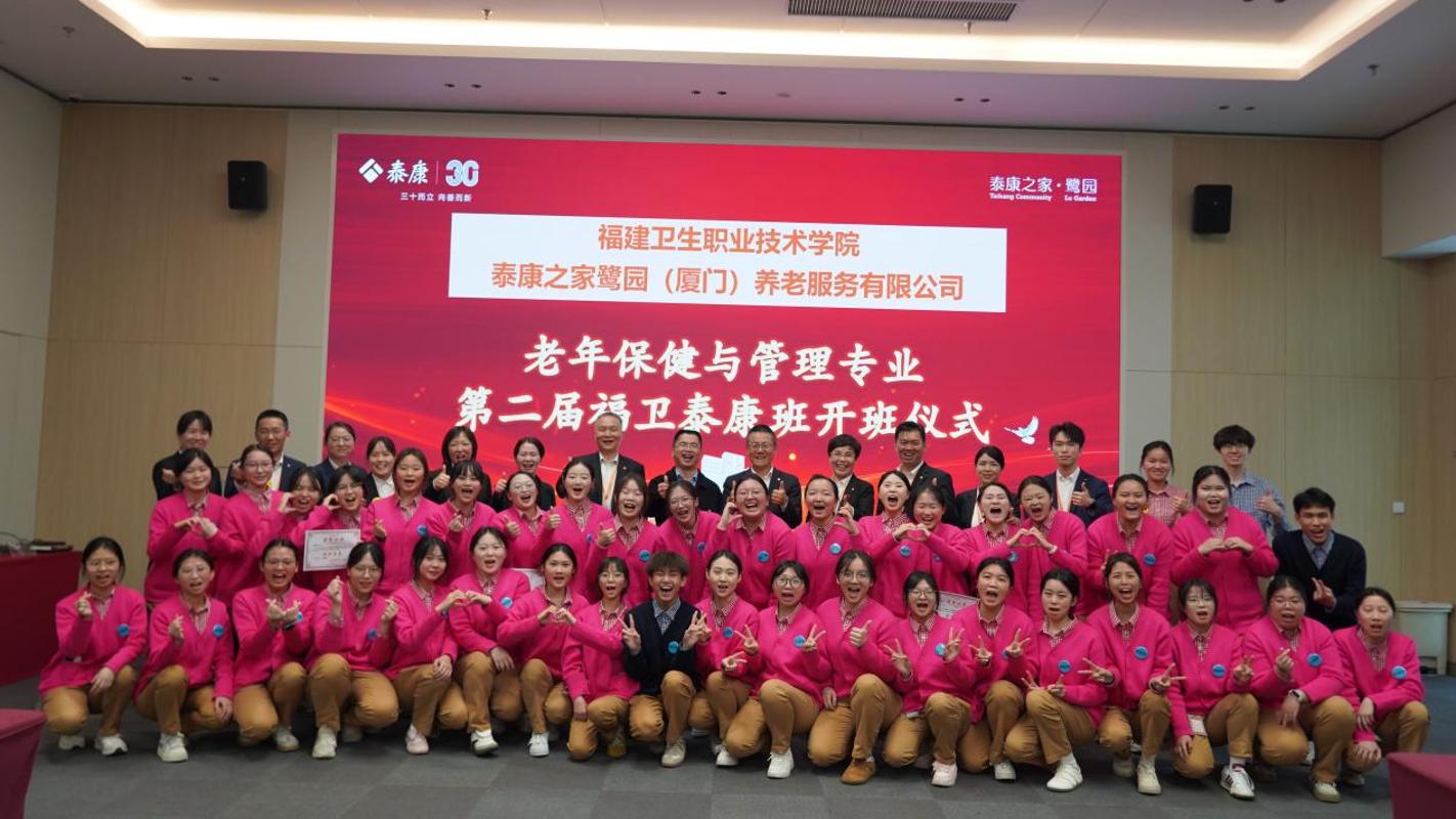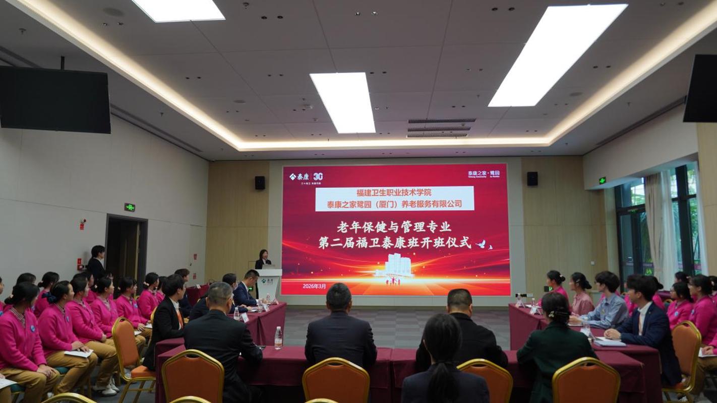 近日,我校与泰康之家・鹭园合作的第二届老年保健与管理专业“泰康认知症照护专班”开班仪式圆满举行。护理学院党委书记林颖峰、泰康之家・鹭园社区总经理寇俊剑、泰康之家・鹭园康复医院院长王忠、双方相关负责人及全体合作班学生齐聚一堂,共同见证这一推动康养人才培养与产业需求深度融合的重要时刻。