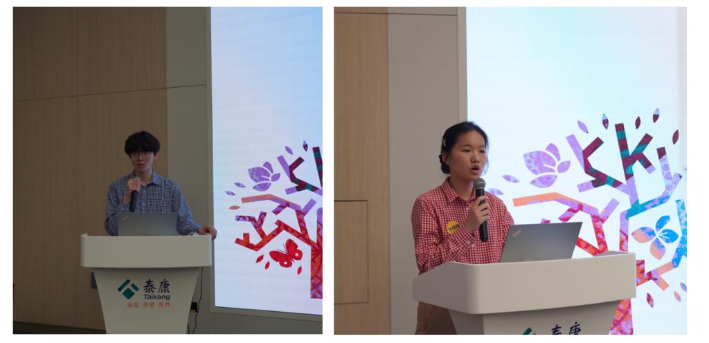 往届学生代表叶玮婷、檀立宏上台分享了在泰康实习与工作的成长经历,从专业技能提升到职业素养养成,生动展现了校企合作模式下的育人成果,为在场新生树立了学习榜样。