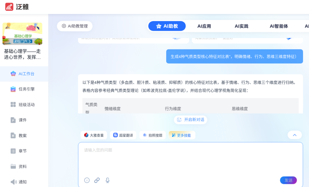 授课中,徐老师围绕教学主题,依托PPT系统讲解气质的定义、属性及四种经典类型,并通过具象比喻助力学生理解。同时,借助学习通AI助手生成特征对比表,清晰呈现核心知识点,精准破解教学难点。