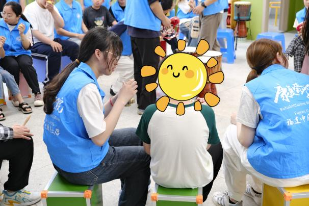 奥尔夫音乐环节将活动推向高潮。在学生志愿者引导下,10名儿童围坐成圈,随着音乐的旋律敲击铃鼓、摇摆身体,孩子们露出了灿烂笑容。“音乐超越了语言与认知障碍,唤醒了他们的表达欲望。”音乐治疗的学生志愿者解释道。