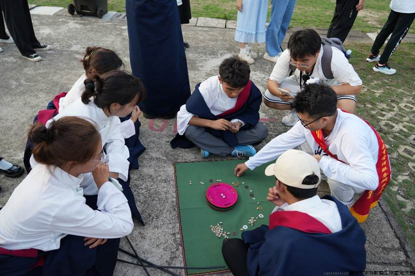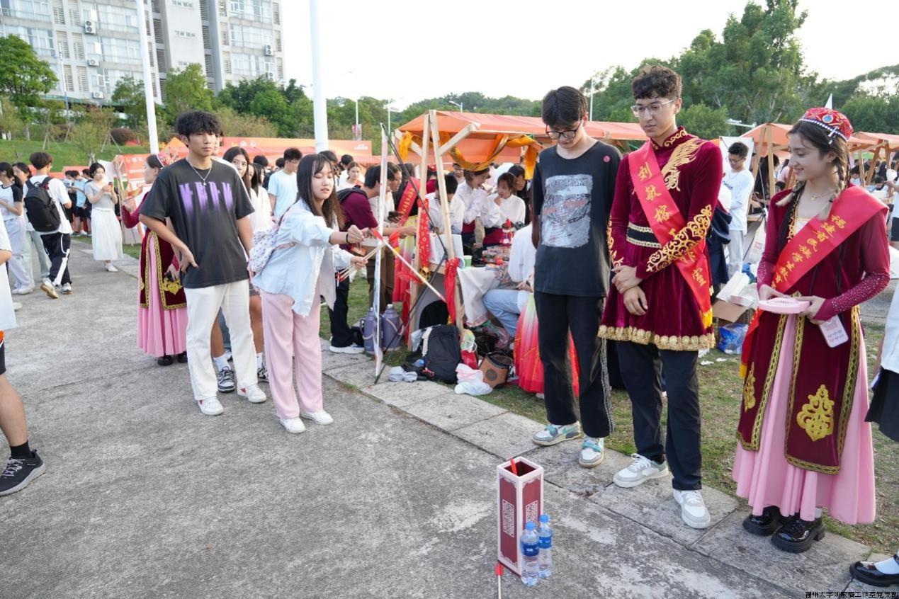 首先看到活动现场,“三爱读书社”设置了极具民族特色的摊位,桌上摆放有干果类新疆特产、西藏甜茶、糌粑和奶渣等,吸引众多同学前来品尝,让大家充分感受西域风情。接着,投壶、踢毽子、认藏文数字等趣味性游戏尽收眼底,让同学们跃跃欲试,欢乐的氛围弥漫全场,每个同学都收获满满。