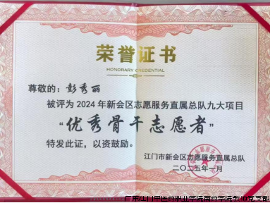 彭秀丽同志凭借专业科普志愿服务中的突出表现,获高度赞誉。被新会义工联授予“优秀骨干志愿者”荣誉称号,对她以党员之姿、专业之长,开展丰富多样的义务服务活动,将南药知识播撒四方表示肯定。这份荣誉不仅是对她个人奉献的认可,更彰显了志愿服务精神的光芒,激励全体师生勇担社会责任,续写公益新篇!