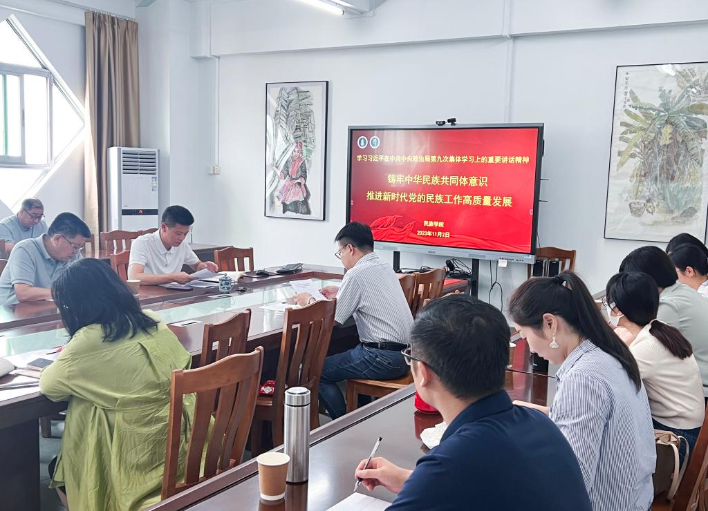 会上,学院院长杨文炯领学了习近平总书记在中共中央政治局第九次集体学习的重要讲话《铸牢中华民族共同体意识 推进新时代党的民族工作高质量发展》。杨文炯全面回顾了党的十八大以来各个时期党关于民族工作的讲话精神和工作要求,系统梳理了习近平总书记关于加强改进民族工作的重要讲话、论述和指示精神。杨文炯要求全院教工要坚持以习近平总书记关于加强和改进民族工作的重要思想为指导,结合民族学学科发展、研究方向、研究热点等方面,全面提升我校国家民委铸牢中华民族共同体意识研究基地的研究水平,把握时代大势和教育大局,服务国家发展战略,主动对接新文科发展的新要求,围绕“中国式现代化在粤港澳大湾区的实践”深耕细作,以民族学一级学科博士点建设为抓手,紧扣铸牢中华民族共同体意识这条主线,不断推动民族学学科建设和学院高质量发展,为推进中华民族共同体建设作出更大贡献。