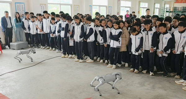 活动现场最引人注目的莫过于机器狗的精彩表演。伴随着《如果感到幸福你就拍拍手》的欢快旋律,两台机器狗同步起舞,点头、挥手、转身、跳跃等动作精准流畅,更会模仿“拍拍手”“跺跺脚”与学生互动。灵动的姿态、默契的配合,让现场瞬间沸腾,安静的会场化作掌声与欢呼声交织的海洋。原本冰冷的科技产品,此刻成为传递快乐与温暖的“智慧伙伴”,让学生真切感受科技的温度。