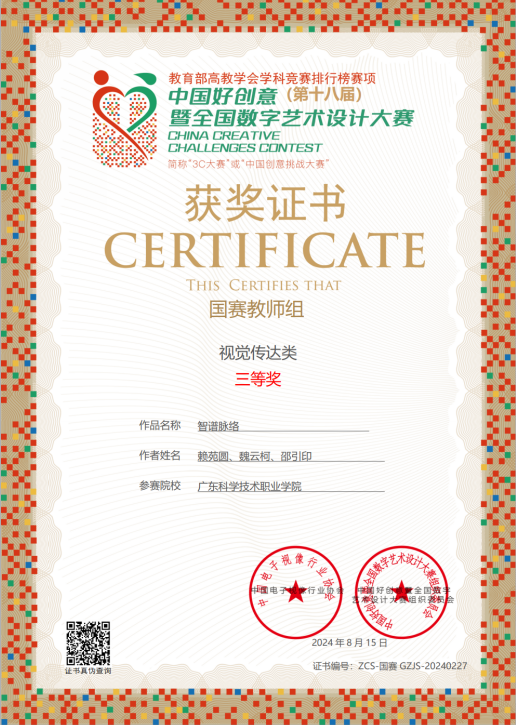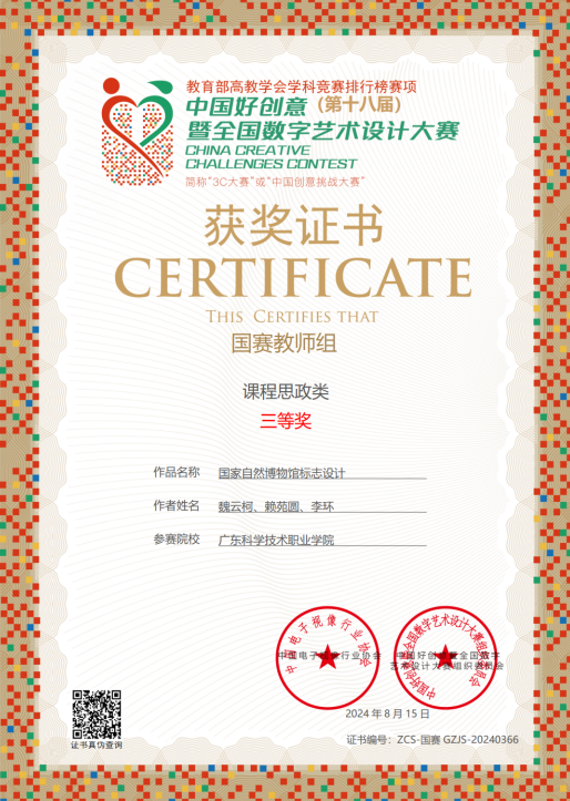 我院参赛获奖作品《国家自然博物馆标志设计》选取国家自然博物馆藏品中具有代表性的植物、动物等进行设计,传播效力强,展现了中国特色和文化自信,传达人与自然和谐共生的理念;《智谱脉络》作品聚焦人工智能这一新质生产力引擎,将人工智能发展历程、应用领域及社会影响等进行艺术创意可视化呈现;《螺音》为城市边缘性乡村焕发生机,重寻旧彩,是对扎根土地本土文化的溯源,以及新旧建筑的融合创新。计算机学院坚持教学相长,分类组建教师团队参加各类专业竞赛,不断提升教师数字素养和教学水平。