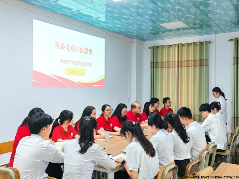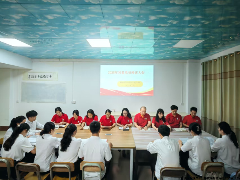 为强化党员队伍建设,保持党员队伍生机活力,助推党建工作高质量发展。7月9日,在广东茂名健康职业学院临床医学系教师党支部“匠心铸医魂”工作室的指导下,临床医学系学生党支部在潘茂名中医传承班教室召开预备党员转正大会,审议表决陈瀚媚等9名同志的转正事宜。会议由临床医学系学生党支部书记陈咏嫦主持,党总支部书记陈应娟莅临指导。