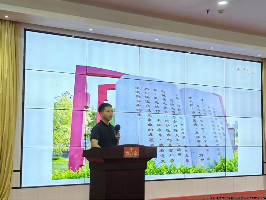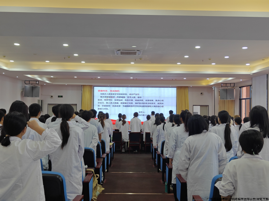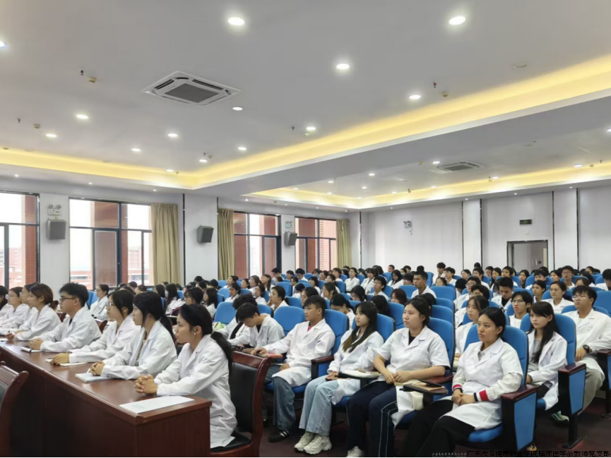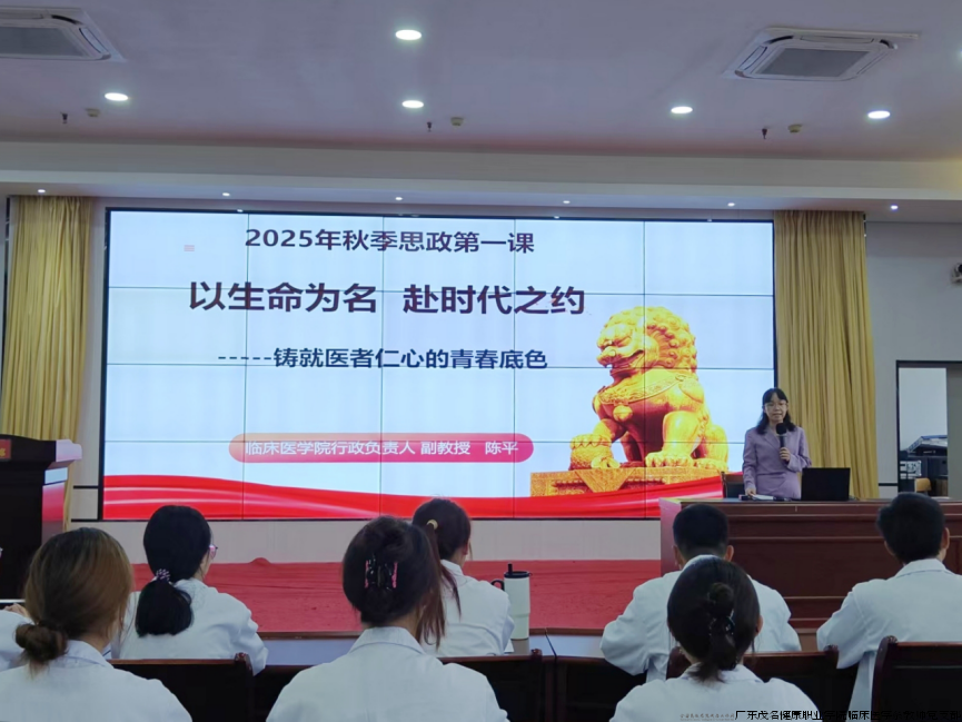 为引导学院青年在新时代浪潮中找准定位、明确未来职业发展方向,在广东茂名健康职业学院临床医学院教师党支部“匠心铸医魂”工作室的协助下,2025年11月3日,于行政楼七楼会议室开展2025年秋季临床医学院思政第一课。临床医学院行政负责人陈平、临床医学院党务办主任陈海富,及2025级临床医学、预防医学专业180余名学生参与本次活动。