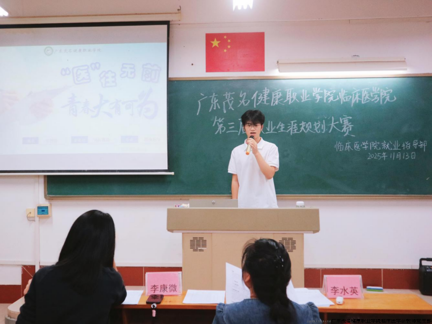 “凡事预则立,不预则废。”为助力同学们深度挖掘自我潜能,明晰职业方向,提升职业规划能力,2025年11月13日下午,在广东茂名健康职业学院临床医学院教师党支部“匠心铸医魂”工作室的指导下,临床医学院就业指导部于教学B104及B105教室举办了第三届大学生职业生涯规划大赛。出席本次大赛的评委老师有临床医学院辅导员吴婉雅老师、李水英老师、李康微老师和梁静老师。