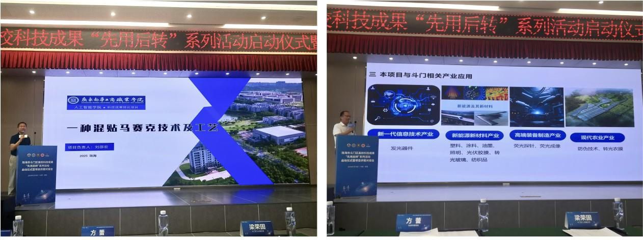 在项目路演环节,我校人工智能学院副教授刘邵宏团队的“混贴马赛克技术及工艺”和文化旅游学院博士胡建华团队的“刺激响应型氮杂环化合物制备技术”进行了精彩展示,两项技术均与斗门区“3+1”主导产业高度契合,在技术合作、成果转化及市场应用等方面展现出良好前景。此次对接会进一步落实我校与斗门区科技工业信息化局2025年1月签订的战略合作协议,为双方共建“政产学研用”协同创新平台、促进科技成果转化落地提供了重要契机。