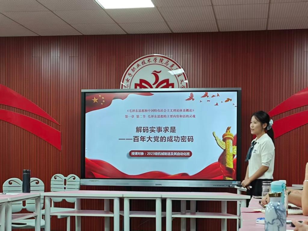 2025年度广东高校思想政治理论课教师教学基本功比赛一等奖获得者、广东水利水电职业技术学院马院袁诗蓓老师,以《解码实事求是——百年大党的成功密码》为题,带来一堂条理清晰、内容翔实的思政教学示范课。她从“实事求是从何而来”“实事求是有何内涵”以及“新时代新青年如何坚持实事求是”三个层面展开讲解,其清晰的逻辑、生动的语言与从容的教态赢得了在场教师的一致好评,让大家享受了一场高质量的教学盛宴。