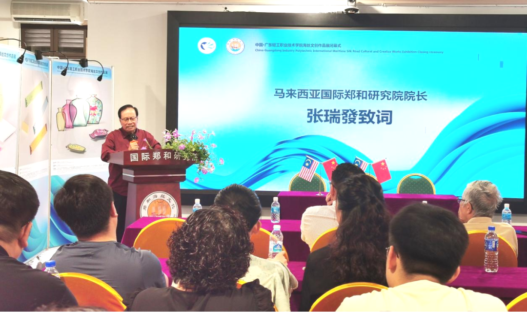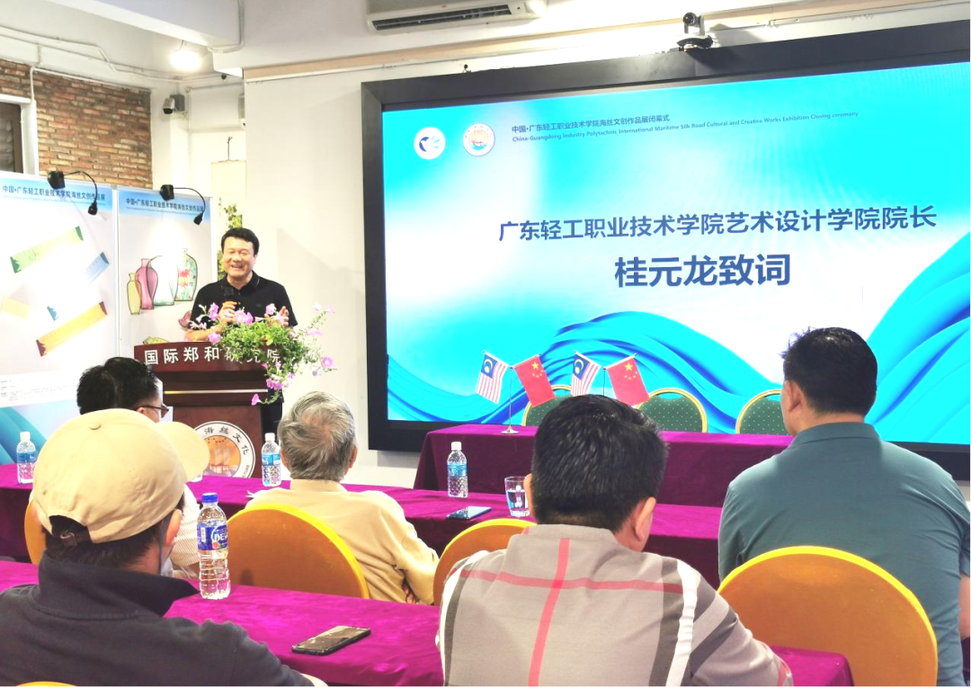 马来西亚国际郑和研究院院长张瑞发在致词中,赞扬了本次展览对于创新性发展优秀传统文化、促进中马文化交流的重要价值。桂元龙院长在致词中,感谢国际郑和研究院和文化馆为海丝文创作品展和文创研发基地建设做出的贡献,表示要依托海丝文创研发基地,协同国内和马来西亚院校将海丝文创打造成一个国际化特色品牌项目。