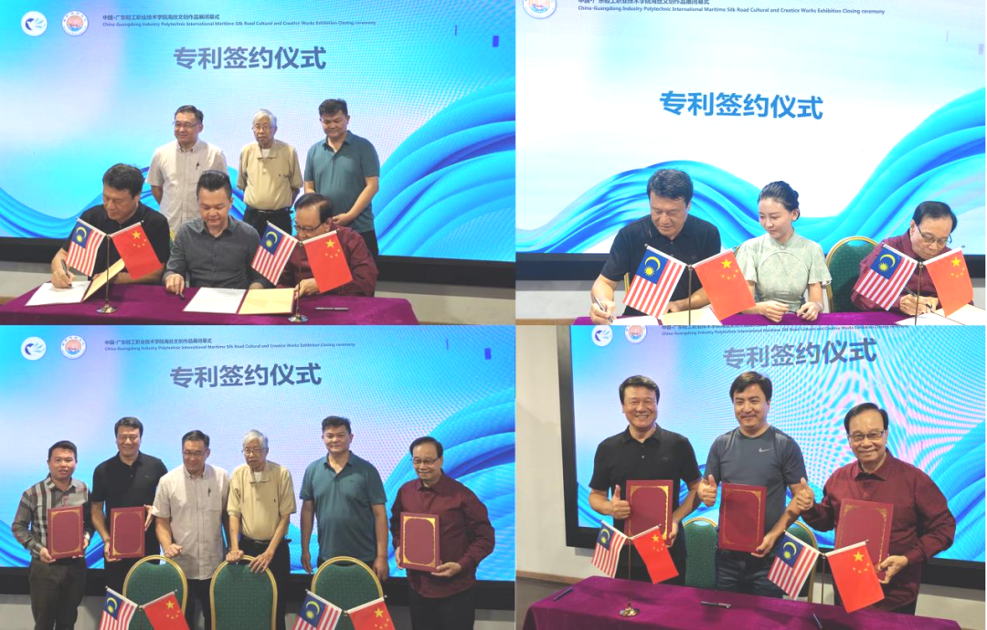 闭幕式最后举行了海丝文创作品知识产权授权使用签约仪式,在马来西亚中国公共关系协会副会长拿督威拉颜天禄、国际郑和研究院陈达生博士和周安兵董事的见证下,马来西亚龙马进出口公司(LongMa Import & Export Sdn Bhd)、南洋草药有限公司(Nan Yang Herbs Sdn Bhd)、马中全球教育咨询公司(MC Global Eduinfo Sdn Bhd)、博灵公司(Boling Realty Sdn Bhd)的代表与广东轻工职业技术学院代表和国际郑和研究院代表,签署了“郑和纸雕灯”“双面拼图”“撑花伞”“郑和IP”等10件套海丝文创作品的独家知识产权授权使用协议。至此,“中国·广东轻工职业技术学院海丝文创作品展暨海丝文创研发基地揭牌仪式”活动完成全部计划任务,取得圆满成功。