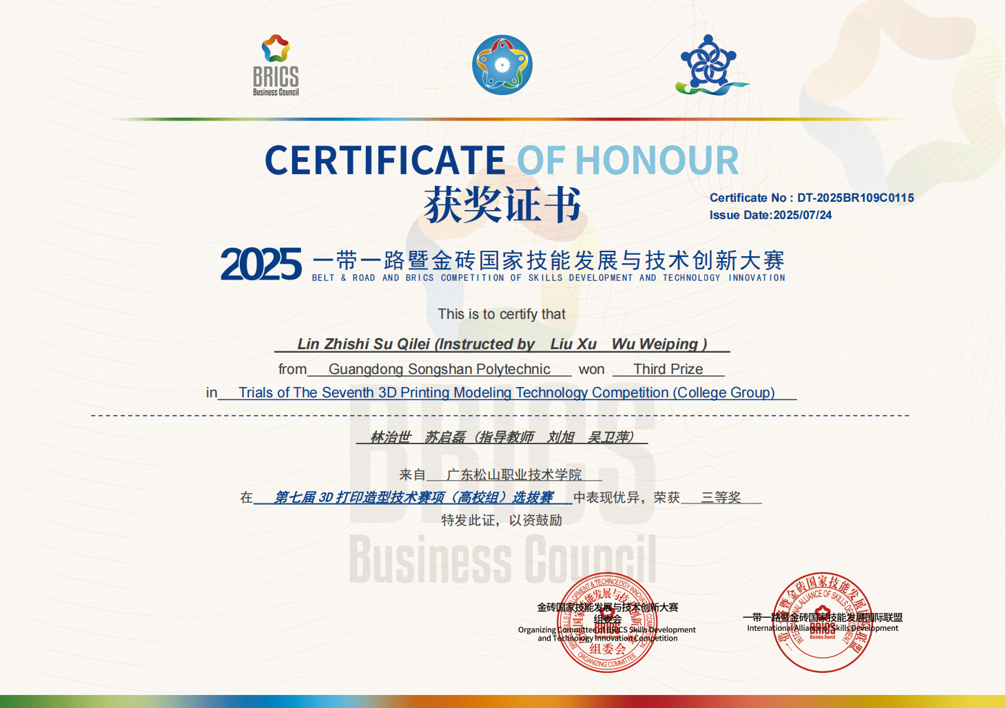 7月20日,机械设计与制造专业竞赛团队参加了在武汉举办的“2025一带一路暨金砖国家技能发展与技术创新大赛——第七届3D打印造型技术赛项选拔赛”,其中1队获“三等奖”(晋级决赛资格),2队获“优秀奖”。
