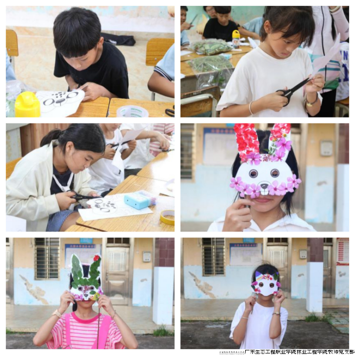 在“自然面具”创作环节,突击队员分组带领儿童采集本土植物素材,手把手指导裁剪、拼贴等创意手法,将自然元素与儿童想象力结合,创作22件充满童趣与乡土特色的作品,孩子们专注沉浸其中,既锻炼儿童动手能力,又让其在实践中感受本土自然文化之美,助力乡村文化创意培育与自然文化资源保护。