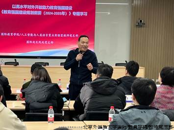 2025年2月26日15点,北京外国语大学国际教育学院、人工智能与人类语言重点实验室教师党支部、国际处孔院处党支部以“以高水平对外开放助力教育强国建设”为主题,在主楼晨读厅联合开展《教育强国建设规划纲要(2024-2035年)》(以下简称《纲要》)专题学习。中国教育科学研究院比较教育研究所副所长秦琳受邀作专题报告。联学由国际教育学院教师党支部书记涂端午主持,共40余位党员和入党积极分子参与学习。
