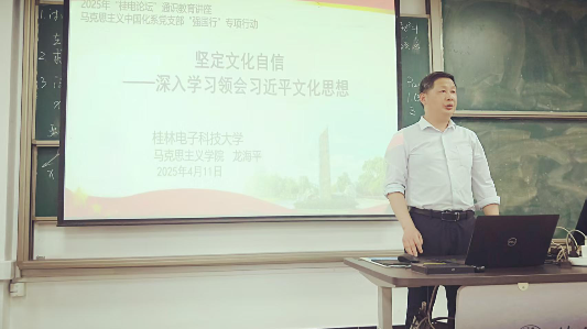 2025年4月11日下午,桂林电子科技大学马克思主义中国化系党支部书记龙海平教授在17212教室为我校大学生作了《坚定文化自信——深入学习领会习近平文化思想》专题讲座。本次讲座系2025年“桂电论坛”通识教育讲座之一,也是马克思主义中国化系党支部“强国行”专项行动之一。讲座以“文化自觉、理论创新、实践部署”梳理习近平文化思想的丰富内涵,从“文化是民族的血脉,是人民的精神家园”“文化兴国运兴,文化强民族强”深化对文化地位和作用的认识;从“五个特性”深化中华文明的认识;从弘扬中华优秀传统文化到桂林传统文化;引导同学们深刻理解文化自信的本质和建设文化强国的重要性,厘清“文化自觉”“文化与文明”“文化软实力”等相关概念,坚持“两个结合”“党的文化领导权”重大意义,引导同学们传承弘扬中华优秀传统文化、坚定文化自信和建设文化强国的自觉性。
