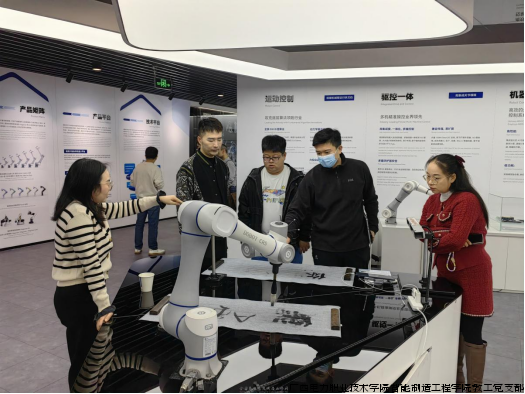调研团队首先在越疆科技展厅前,与企业党员代表共同展示 “‘双带头人’教师党支部书记‘强国行’专项行动” 主题横幅,以党建联建的形式开启此次调研。随后,在企业技术人员的引导下,党员教师们实地观摩了越疆科技的协作机器人产品矩阵,重点了解其 “运动控制”“驱控一体” 等核心技术在工业场景的应用案例 —— 现场演示的协作机器人书法、精密装配等功能,让教师们直观感受到产业技术与教学实训的结合点。