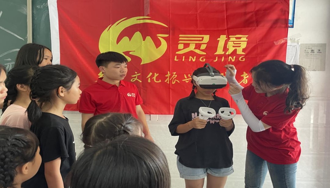 “灵境”乡村文化振兴实践者团成员们利用自有软著专利“智慧红色文化VR仿真服务系统”,通过VR设备向村里的孩子们展现了如湘江纪念馆、百色起义纪念馆等红色文化场馆,并用通俗易懂的语言介绍VR科技科普知识,让孩子们体验到了红色文化的魅力,增加对红色文化的认同感,让红色基因薪火相传。
