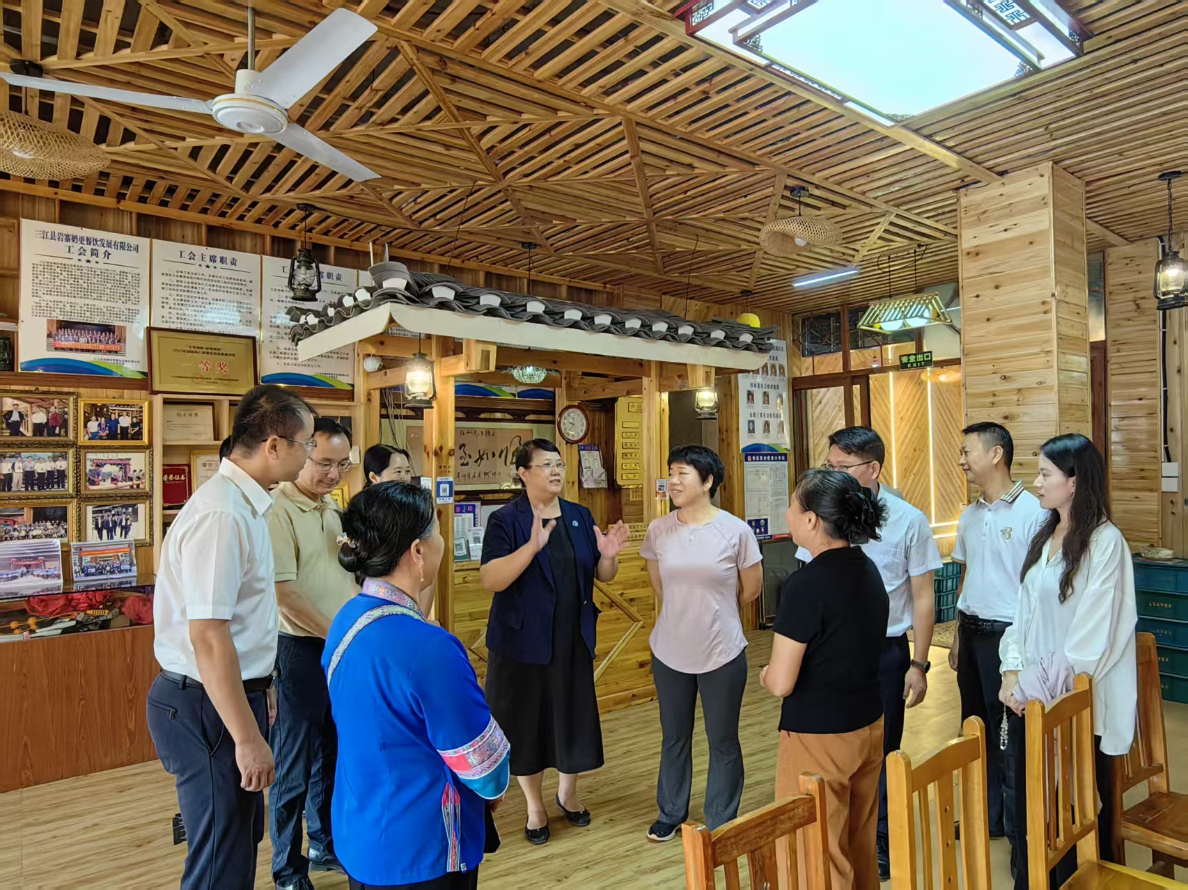 调研过程中,恰逢自治区教育厅副厅长张旭凤一行考察乡村语言高质量发展先行试点建设工作。张旭凤副厅长对三江县乡村语言文字建设成果给予高度评价,强调推广国家通用语言文字对于铸牢中华民族共同体意识、推动民族团结进步的意义重大,鼓励持续创新方法,扩大试点成效。