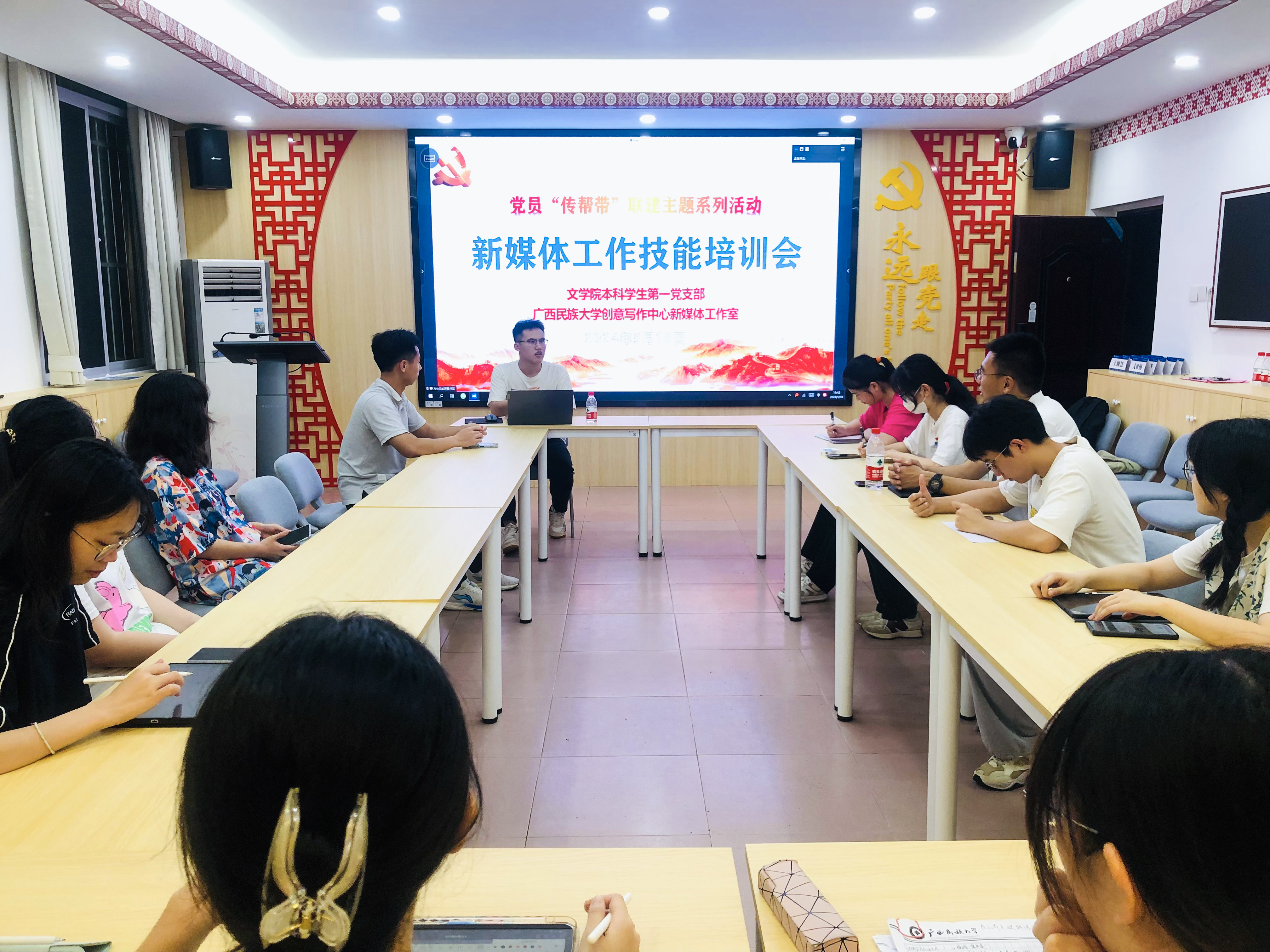 为进一步提升支部党员运用新媒体工具的能力水平,增本领,强素质,推动支部队伍建设走深走实,5月18日晚,文学院本科学生第一党支部在红楼107室举办第二期“党员传帮带”主题活动。本期活动主要讲解“新媒体工作技能”。活动由纪律委员方仕仗主持,支部党员及广西民族大学创意写作中心新媒体工作室成员参加活动。