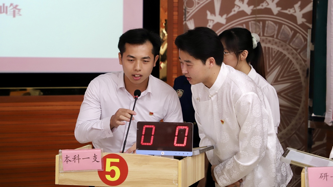 本科学生第一党支部参赛队高度重视,把党史竞赛作为以赛促学的重要载体,精心准备。参赛队员覃志林、赵丹坚多杰、马小丽、潘晓妍在第一环节“狭路相逢”中信心十足,沉着应对单选、多选等多种问题形式,顺利晋级,体现参赛队员丰富的党史知识储备,展现出参赛队员过硬的思想政治素质。在后续环节,参赛队员面对紧张的比赛局面不慌不忙、冷静思考、密切配合,牢牢把握机会,稳步提升分数。在“红歌先锋”环节,当《草原上升起不落的太阳》旋律响起时,参赛队员正确答出歌曲名字并演唱,展现出丰富的红歌储备。最终,经过紧张激烈的比赛,本科学生第一党支部荣获二等奖,支部党员覃志林获得最佳MVP奖。