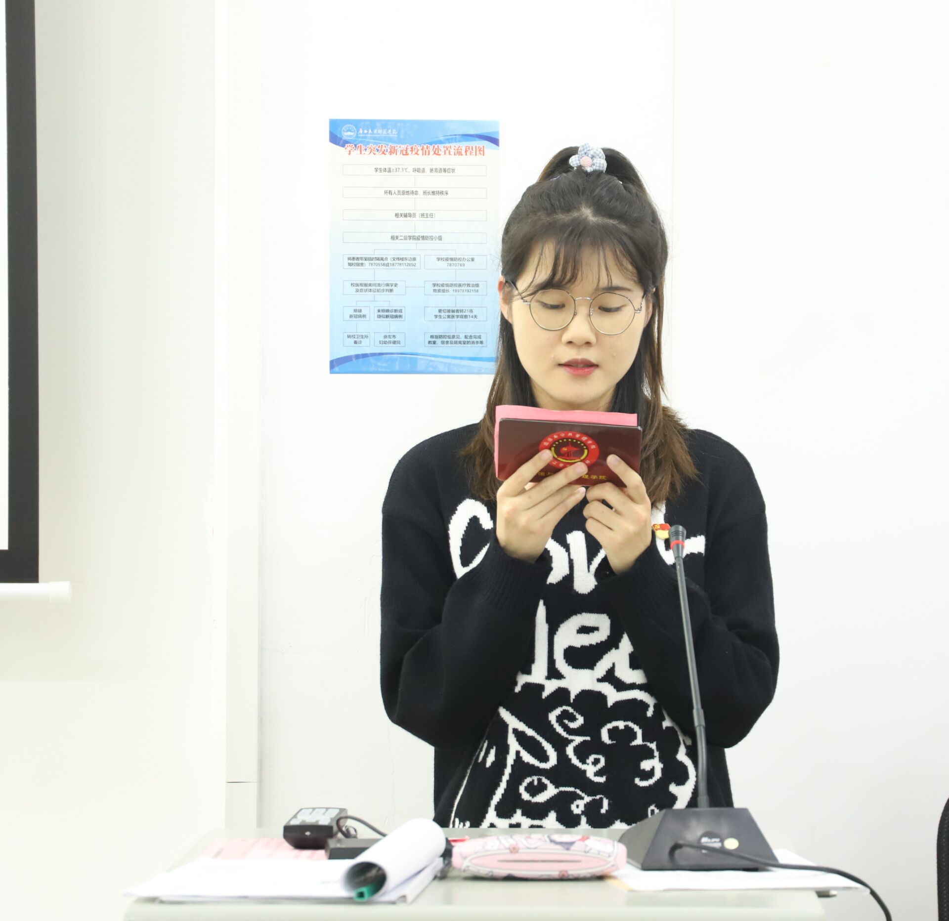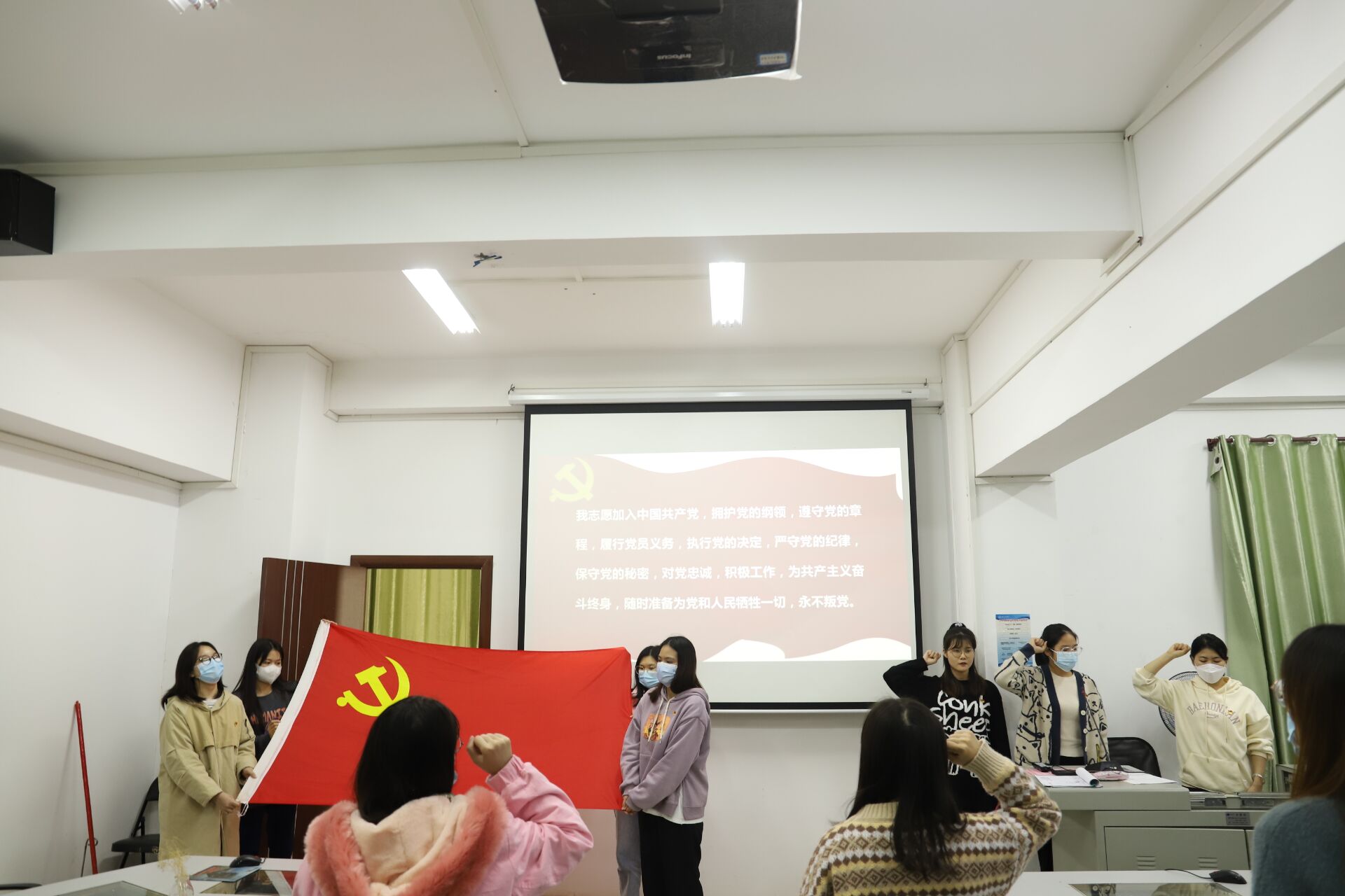 在学习《条例》之前,政治与公共管理学院第二学生党支部为新加入支部的18名同志举行入党宣誓仪式,首先,全体参会人员奏唱《国际歌》,由莫深梅同志带领全体同志进行入党誓词宣誓,紧接着预备党员代表王慧珊同志发言,她分享了自己进入支部之后的感受以及未来的规划,她表示在未来会以一个积极的面貌配合二支部的各项工作,为支部尽心尽力。