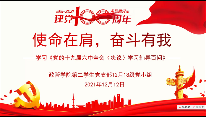 为了使党员同志们对十九届六中全会决议有更深刻的理解,认识到为什么说习近平新时代中国特色社会主义思想实现了马克思主义中国化新的飞跃,政管学院第二学生党支部18级于2021年12月12日晚上18:00在线上开展12月“使命在肩,奋斗有我”党小组会议。本次会议由韦香利同志主持,参会人员有政管学院第二学生党支部18级党小组全体人员。