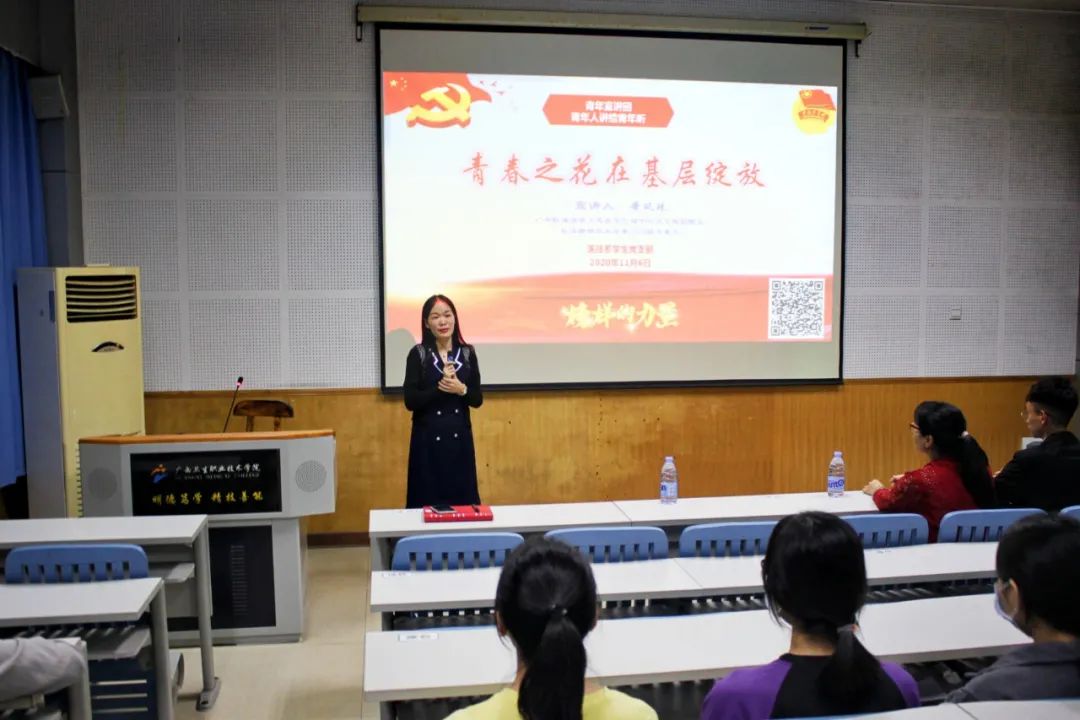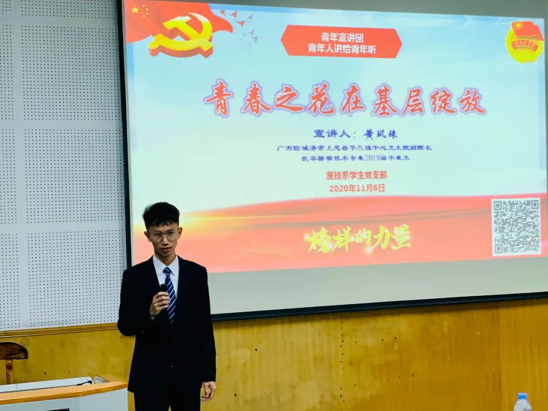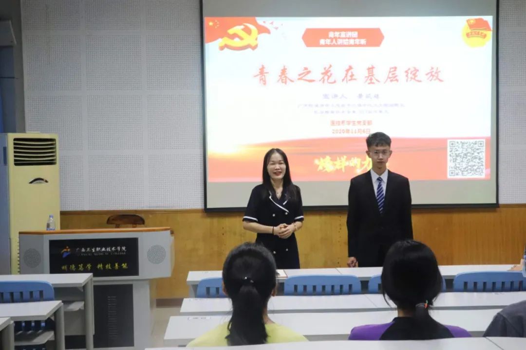 2020年11月6日,医技系学生党支部青年宣讲团又与同学们见面了。此次活动邀请了医学检验技术专业2019届毕业生,现任上思县华兰镇中心卫生院副院长黄矶珠主讲。结合我院即将召开的双选会,本次宣讲的主题为:青春之花在基层绽放。