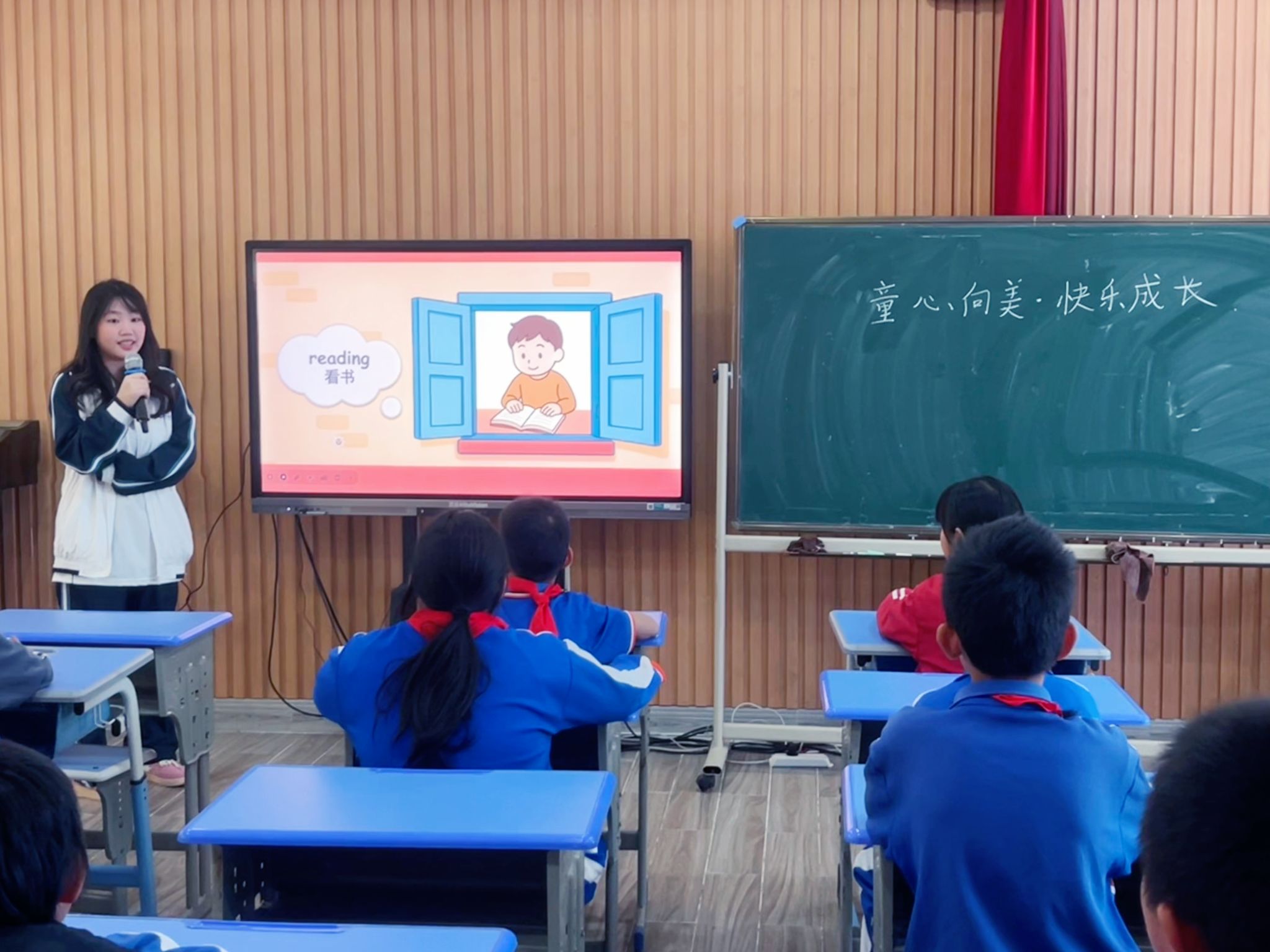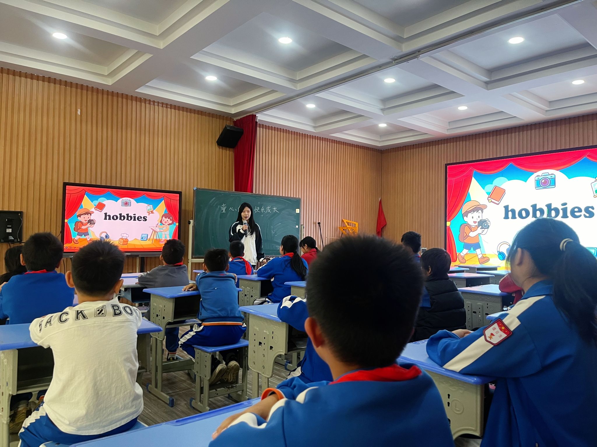 “What is your hobby?” 课堂伊始,志愿者老师们以亲切的提问拉开了序幕。通过色彩缤纷的单词卡片、地道的发音示范和有趣的肢体语言,志愿者们将“singing”“dancing”“drawing”“playing football”等关于兴趣的词汇生动地呈现给孩子们。同学们跟读踊跃,教室里充满了琅琅读书声。