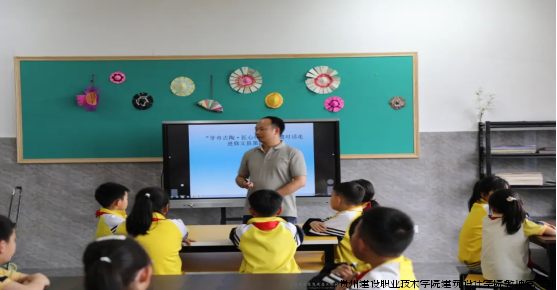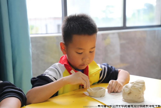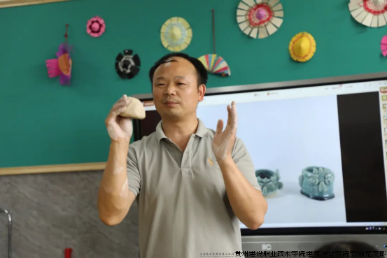 在课程教学环节,贵州省高级工艺美术师、我院陶艺工作室负责人刘元海老师为修文县第四小学二(8)班学生带来了一堂别开生面的牙舟陶文化课程。刘元海以渊博的专业知识,讲解了牙舟陶自明代发端至今的六百年发展脉络、制作工艺和艺术特色。