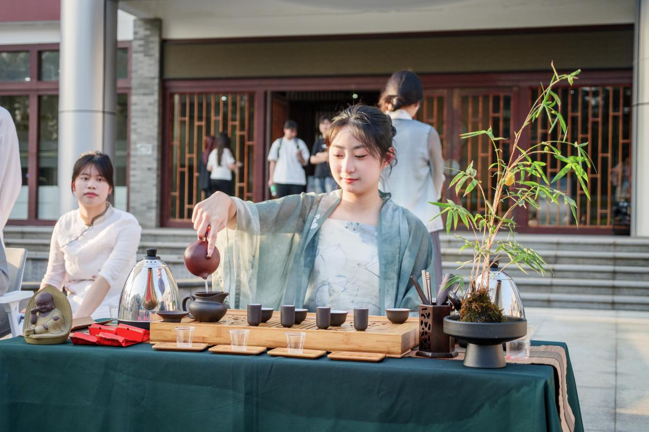 走进学校图书馆一楼中庭广场,一场别开生面的“海丝情缘 商展盛汇”丝路文化体验集市首先映入眼帘。学生们身着汉唐服饰,向来宾展示广绣、广彩、茶艺等传统文化技艺,通过自创互动项目让观众沉浸式体验古代海上贸易场景。
