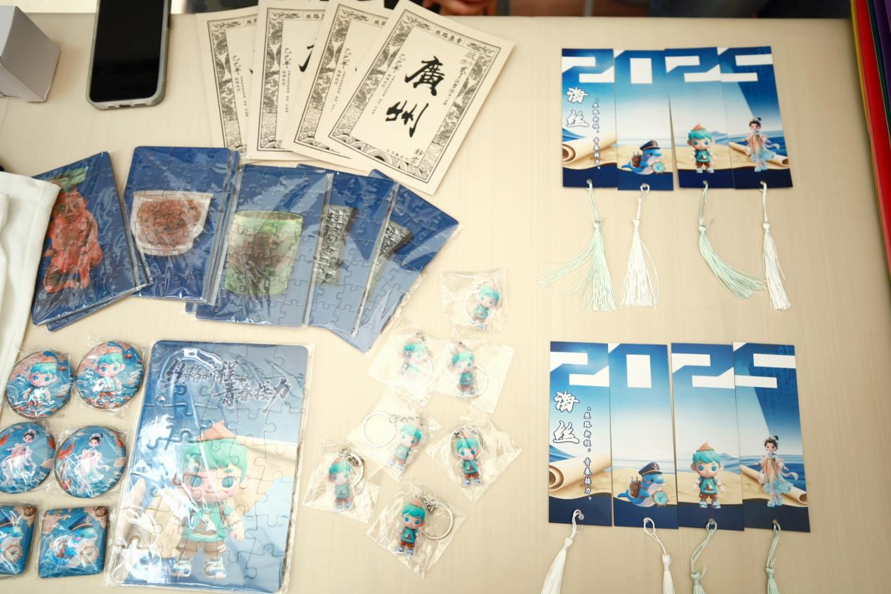 本次海丝文化展以“广州扬帆通海两千年”为主题,主要分为三大板块:历史长廊、非遗传承和青年互动区。学校学生全程参与策展、讲解、创作,打破传统文化展览的呈现方式,让青春活力遇见千年文脉。历史长廊通过精美图片和3D打印文物,系统展现从秦汉到近现代广州作为海上丝绸之路重要节点的发展变迁;非遗传承区集中展示广彩工艺品,观众亲身体验广彩制作技艺,感受精湛技艺与工匠精神;青年互动区则设置了“海丝文化对话当代”互动墙,引导学生书写对新时代文化使命的理解。展览还设置了由学生主导的乐器、皮具体验沙龙,将静态展览与动态演示有机结合。学生们还将海丝元素与现代审美相结合,设计了系列原创文创产品,其中以海丝文化IP形象“海宝”为代表的系列作品颇受欢迎。
