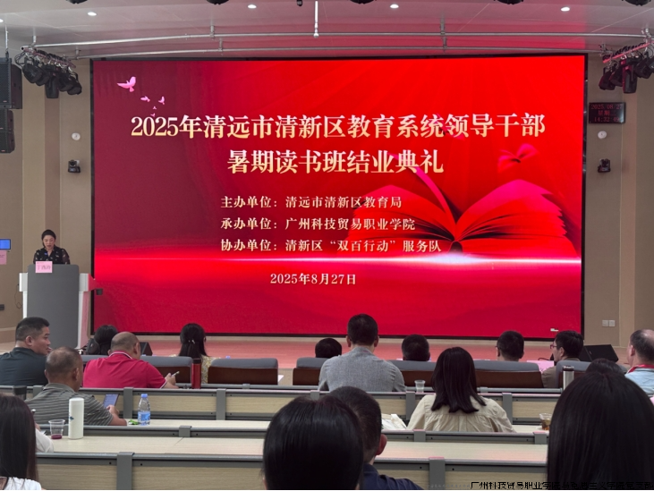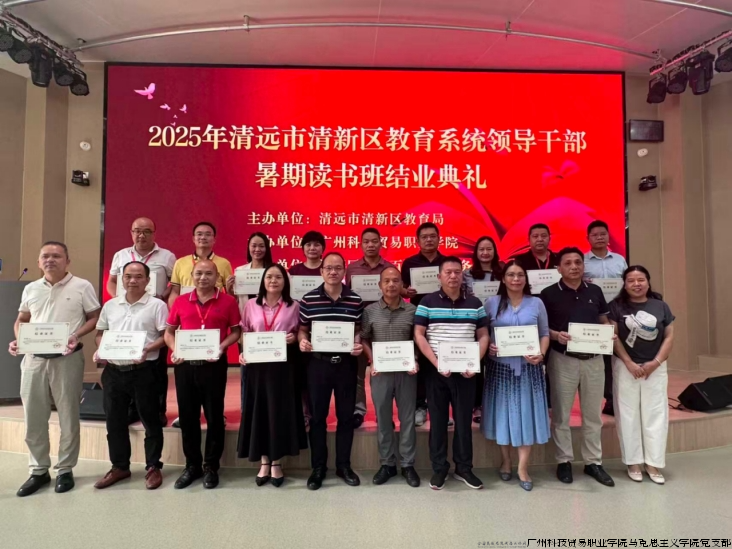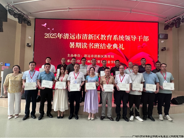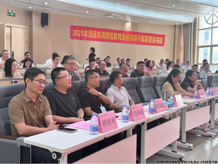 8月27日下午,为期3天的“2025年清远市清新区教育系统领导干部暑期读书班”在我校圆满落幕,清远市清新区教育局党组成员、副局长龙振扬,教育局党组成员、督导室主任陈国栋,教育局办公室主任邹淑婷,广州科技贸易职业学院继续教育学院院长段智敏,党委组织部副部长尹连萍,马克思主义学院书记、院长丁西泠,马克思主义学院副院长陈琴,学校派驻清新区“双百行动”服务队副队长赖晓彬以及项目相关老师参加了结业典礼,丁西泠主持结业仪式。本次培训也是支部“党建+心理”品牌特色应用于社会服务的实践活动之一。